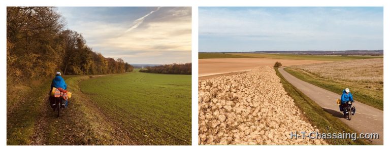Hier, nous avons roulé avec beaucoup de vent de face sur des routes et des chemins pas des plus sympathiques (grandes parcelles de betteraves sucrière, de colza ou de patates avec dedans, à 4 ou 5 reprises, de gros tracteurs qui pulvérisaient on ne sait quoi un peu partout vu le zef qu’il y avait) ; ce qui fait que nous sommes arrivés chez nos charmants hôtes WarmShower d’un soir à la nuit tombée.