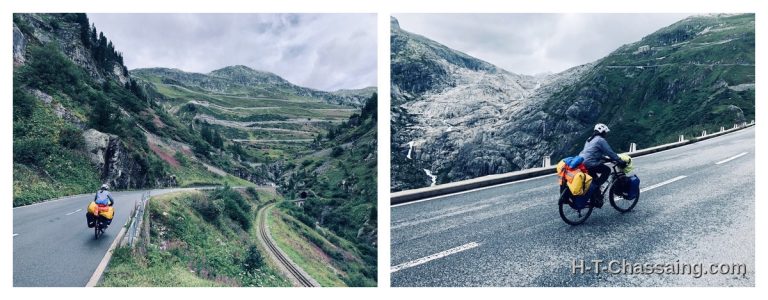 Après, autour du lac Léman et dans la plaine assez large du Rhône avec de hauts sommets de chaque côté (plutôt intimidants pour les petits cyclistes que nous sommes), on a bien baissé la cadence (une moyenne de 40 km par jour bien que cela soit plat), histoire de se refaire un peu avant l’attaque des sommets alpins. Se retrouver aux pieds des cols physiquement dans le rouge n’aurait pas été « tip top » comme ils disent ici.