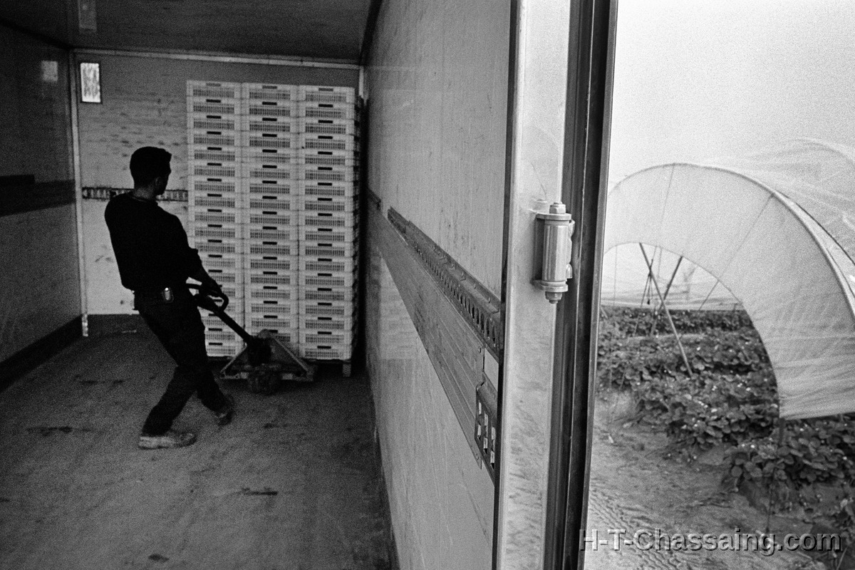 Chargement de la récolte de fraises. 95% de la production espagnole des fraises se fait à Huelva. Espagne, Province de Huelva, 2007