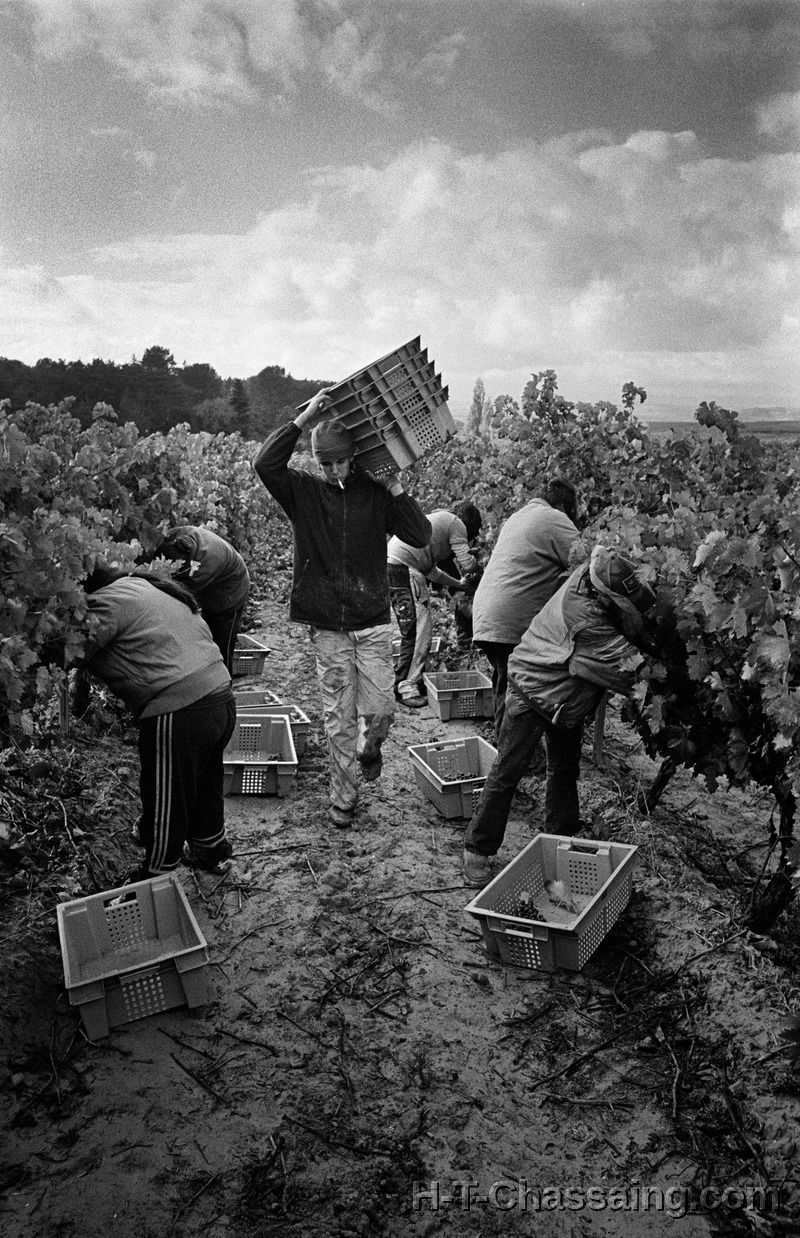 Vendanges effectuées par des ouvriers agricoles gitans. Il y a de moins en moins de travail pour les journaliers, car la machine effectue le travail de 80 personnes dit-on et travaille même la nuit. Sur cette parcelle de terrain néammoins, les hommes étaient nécessaires pour trier les grappes saines de celles pourries. Espagne, Province La Rioja, Haro 2007