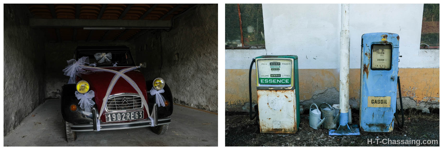 – Dans un garage, une 2CV citroën (dedeuch) avec des décorations de mariage. Puy-de-Dôme, Auvergne. France – 1er Juin 2024.