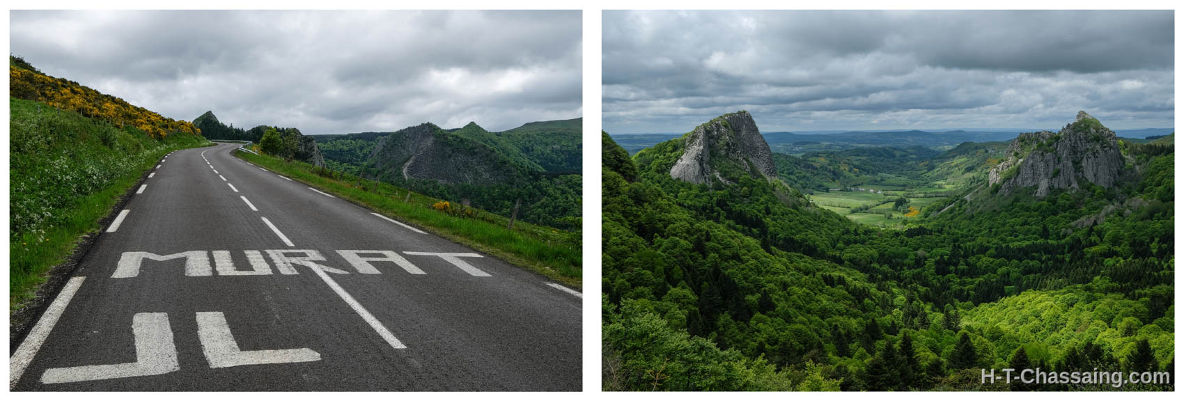 – Vue du Mirador sur les roches Tuilière et Sanadoire. Des noms de lieu que l’on peut entendre dans une chanson de Jean-Louis Murat : « Entre Tuilière et Sanadoire ». On apprendra plus tard que ce sont deux anciens volcans du Sancy-Monts Dore.
