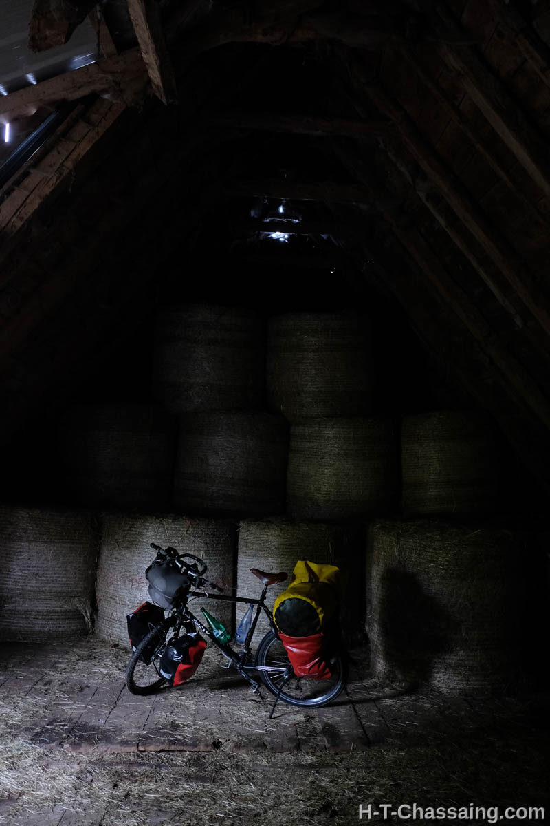 L’un de nos vélos dans la grange typique (avec un toit très pentu) où nous avons passé la nuit. Elle est construite au-dessus de l’étable et une des meules stockées ici est l’équivalent de 20 à 25 portions (les anciennes bottes de paille rectangles). Theil-Soubre. Puy-de-Dôme, Auvergne. France – 30 Mai 2024.