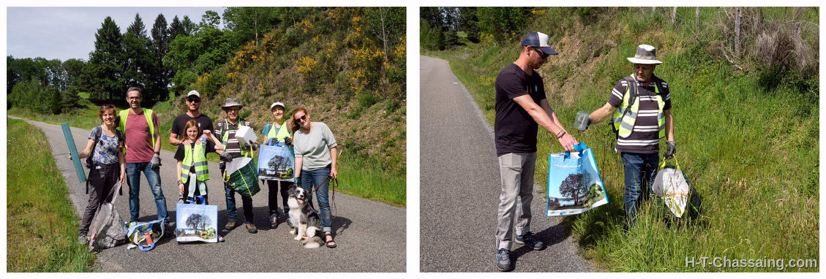 Collecte d’ordures sur les bords de la route par les membres de l’Association Serfouette (petit outil de jardin) de Puycapel (Mourjou – Calvinet). Lors du week-end de la Fête de la Nature nationale. Près de Calvinet. Cantal, Auvergne. France – 25 Mai 2024.