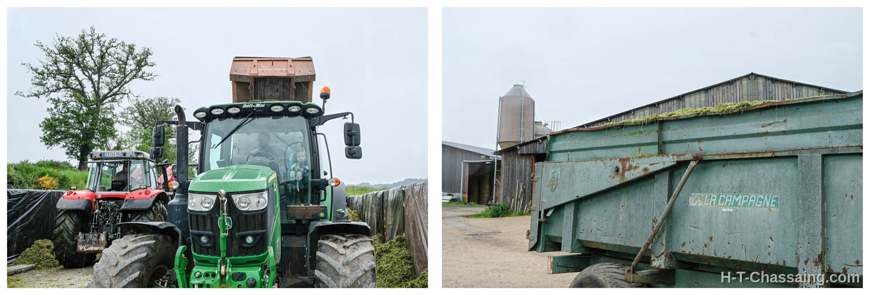 Ensilage avec bébé à bord chez notre hôte du soir. 22 hectares à rentrer en accéléré à cause du mauvais temps ; de nombreux voisins viennent à la rescousse. Après Ydes. Auvergne. France – 29 Mai 2024.