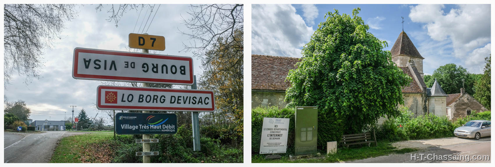 – « Village Très Haut Débit – Tarn et Garonne numérique ». Et panneau Bourg de Visa à l’envers pour symboliser que « On marche sur la tête » : nom du mouvement national de protestation des agriculteurs « contre le trop de réglementations ». Bourg-de-Visa. Tarn-et-Garonne, Occitanie. France – 11 Décembre 2024.
