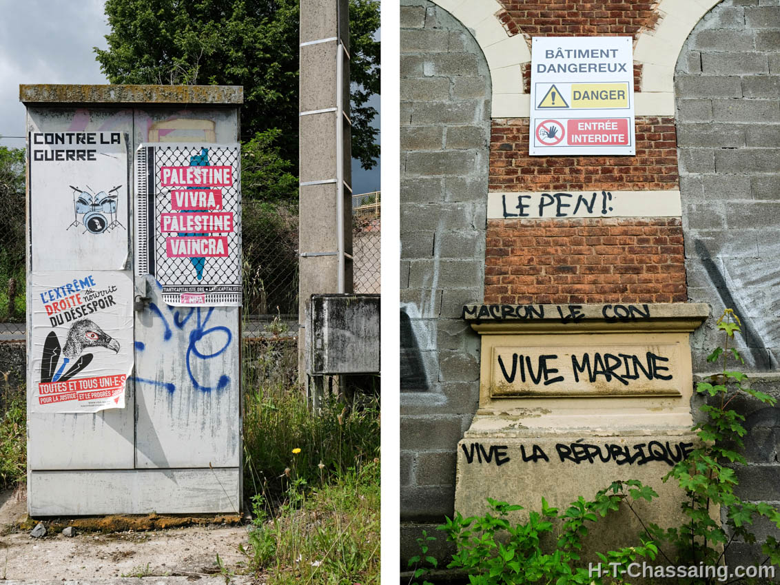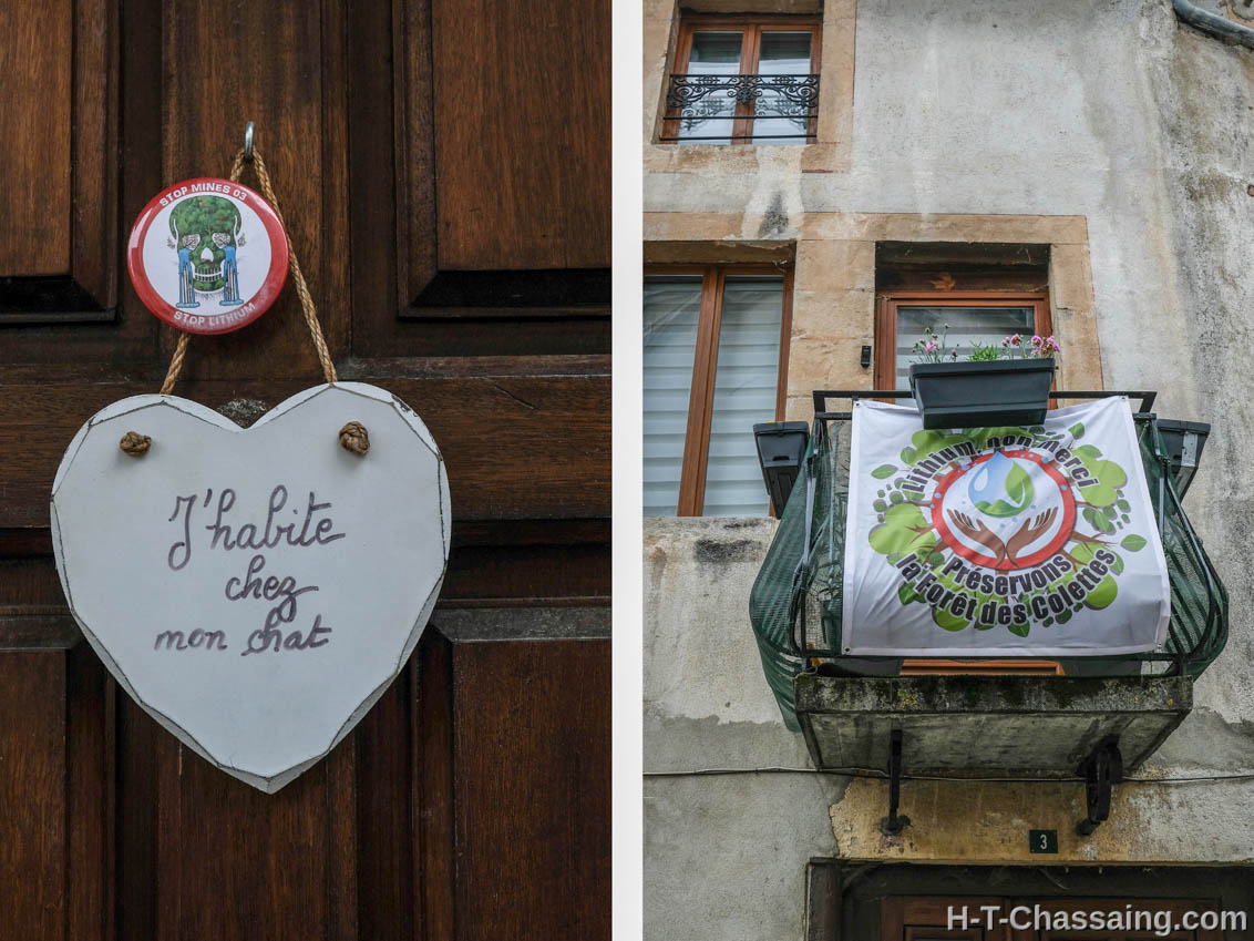 – Sur cette porte d’entrée, parmi d’autres messages : « Stop mine 03 – Stop lithium » « J’habite chez mon chat ».