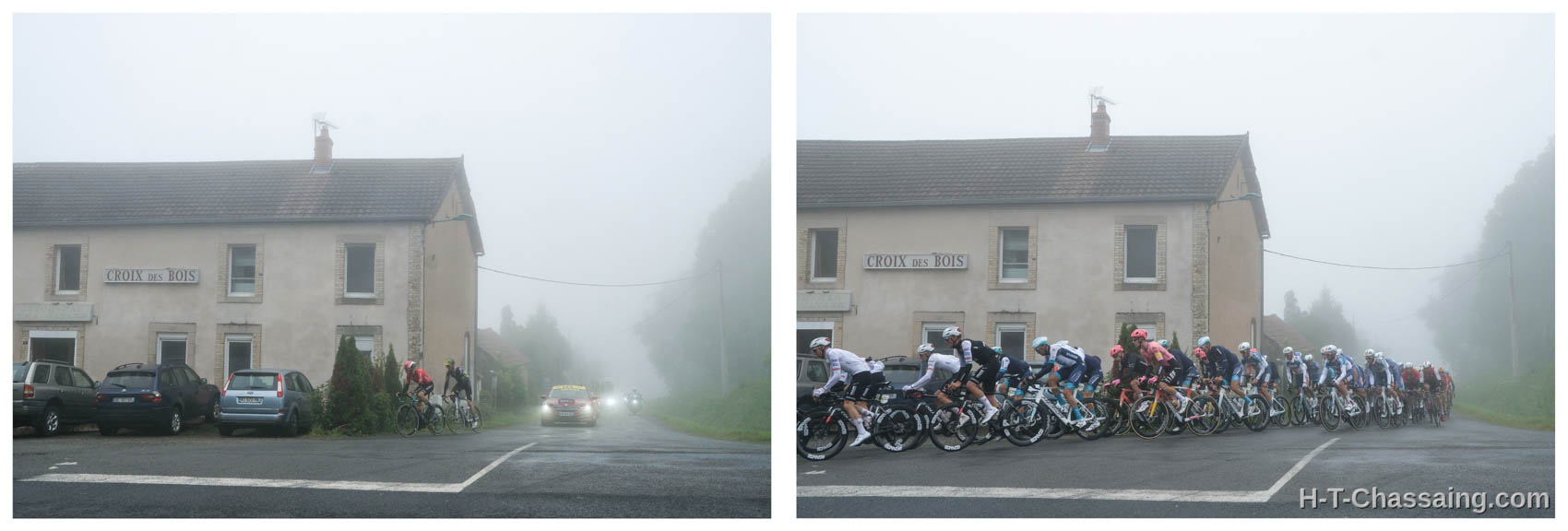 Devant le « Bar Hôtel Restaurant Croix des Bois », passage des coureurs cyclistes du Critérium du Dauphiné. Coutansouze. Forêt domaniale des Colettes. Allier, Auvergne. France – 2 Juin 2024.