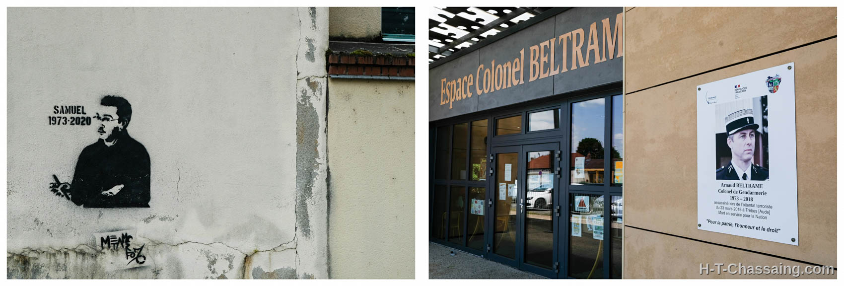 – Tag à l’effigie de Samuel Paty, professeur d’histoire-géographie assassiné par un terroriste islamiste, en 2020, à Conflans-Sainte-Honorine en Île-de-France. Entre Saint-Pourçain et Luthenay-Uxeloup. France – 3 Juin 2024.