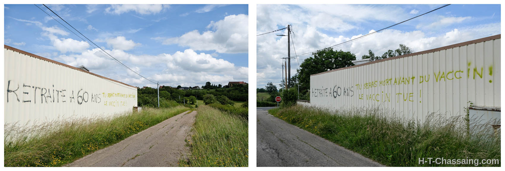– « Tu seras mort avant du vaccin ! Le vaccin tue ! ». Il s’agit ici du vaccin pour lutter contre la pandémie de Covid 19 déclarée en 2020. Chemin du Crêt, entre Varzy et Clamecy. Nièvre, Bourgogne-Franche-Comté. France – 5 Juin 2024.