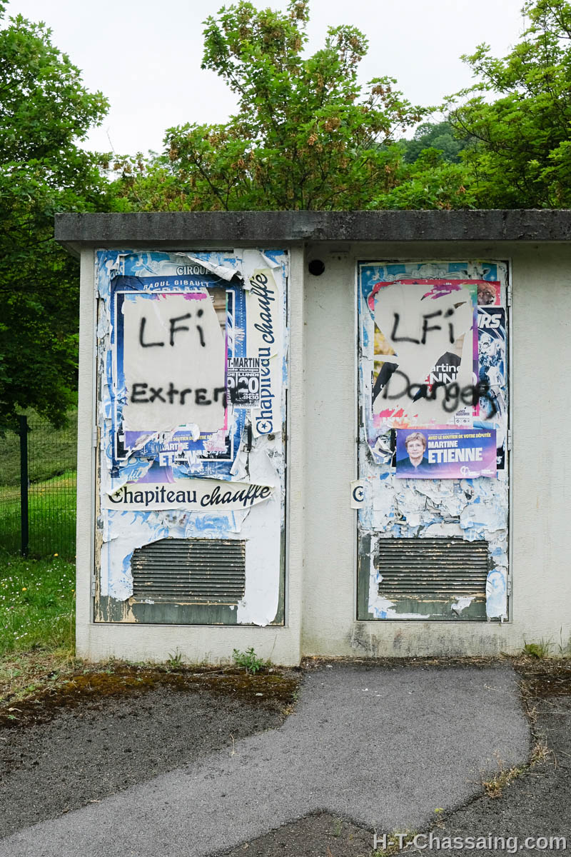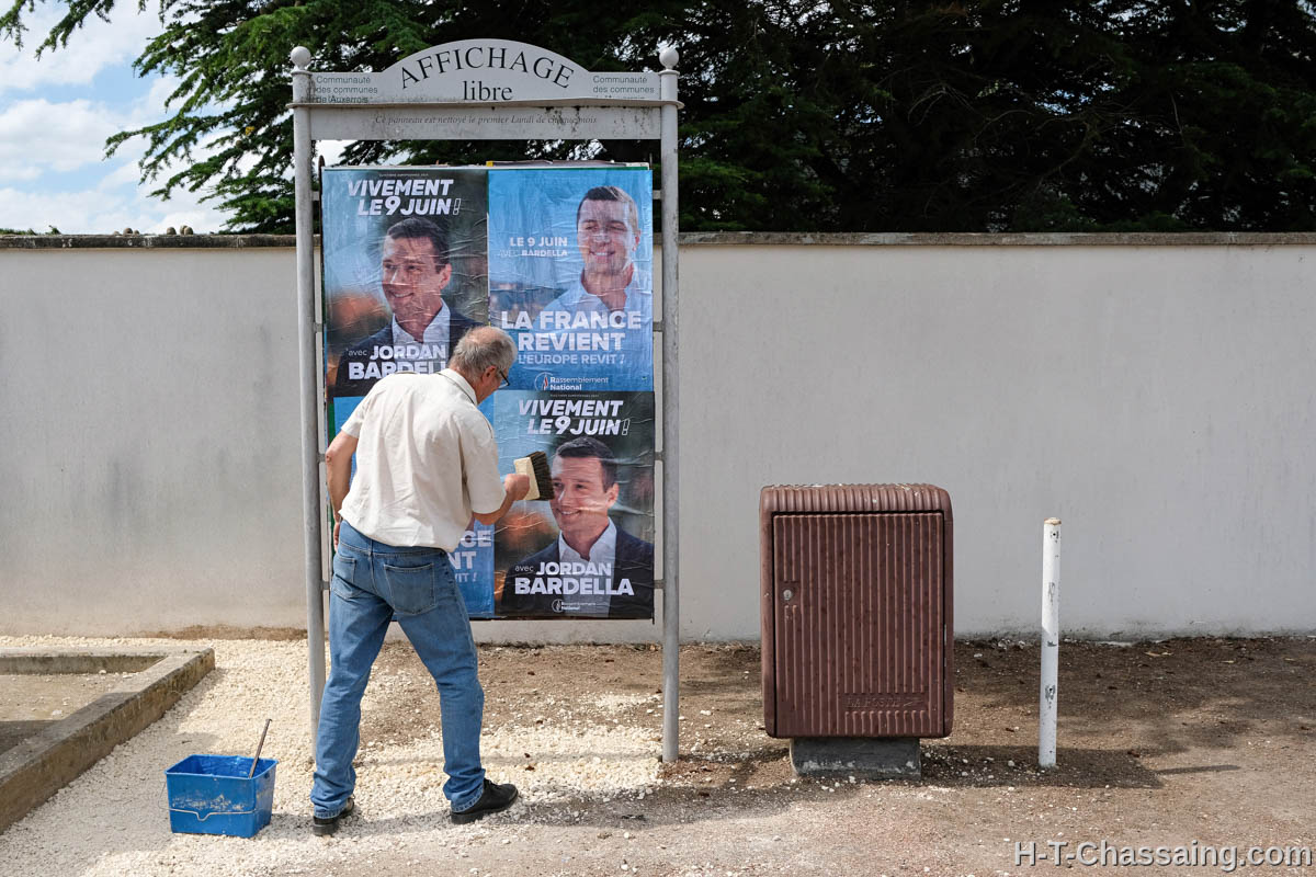 – Sur ces panneaux électoraux pour le choix des députés européens, seule l’affiche du RN n’a pas été déchirée ou bien a été aussitôt remplacée par des militants vigilants. « Dimanche 9 juin – La France revient ! Votez Jordan Bardella – Rassemblement national ».