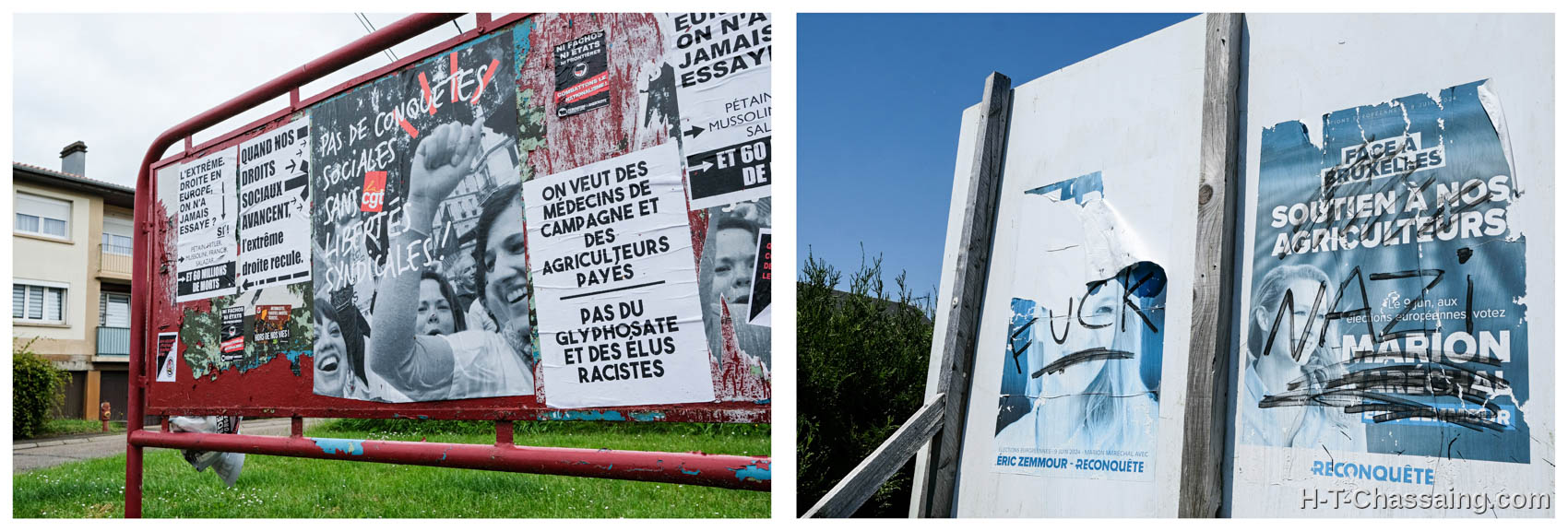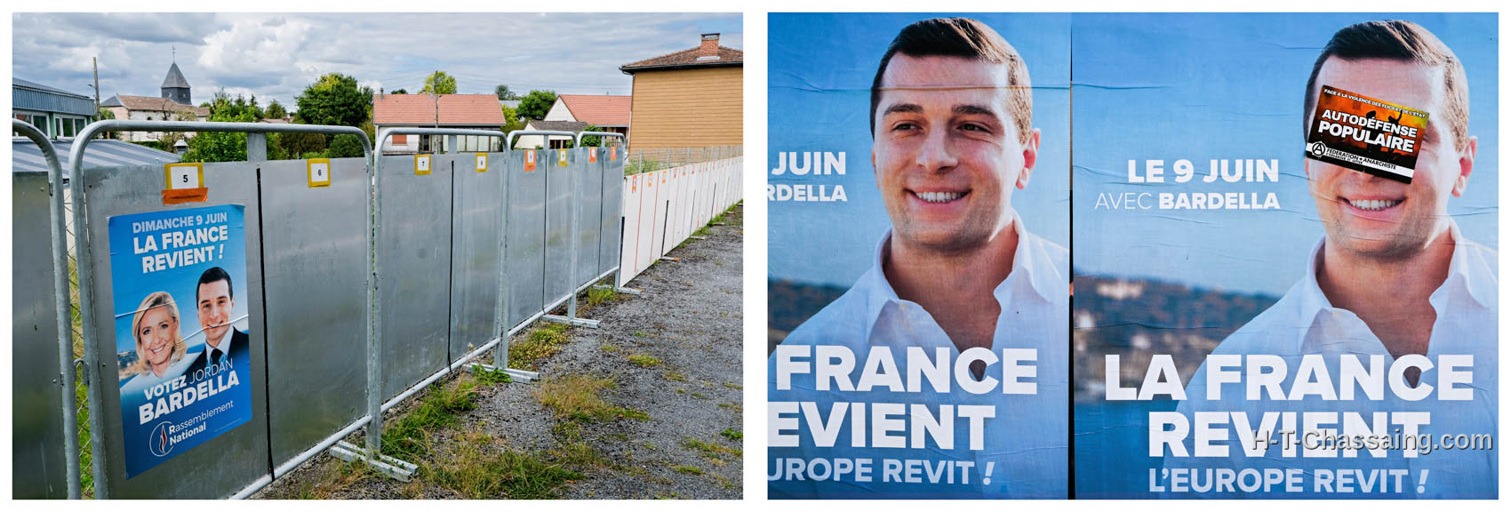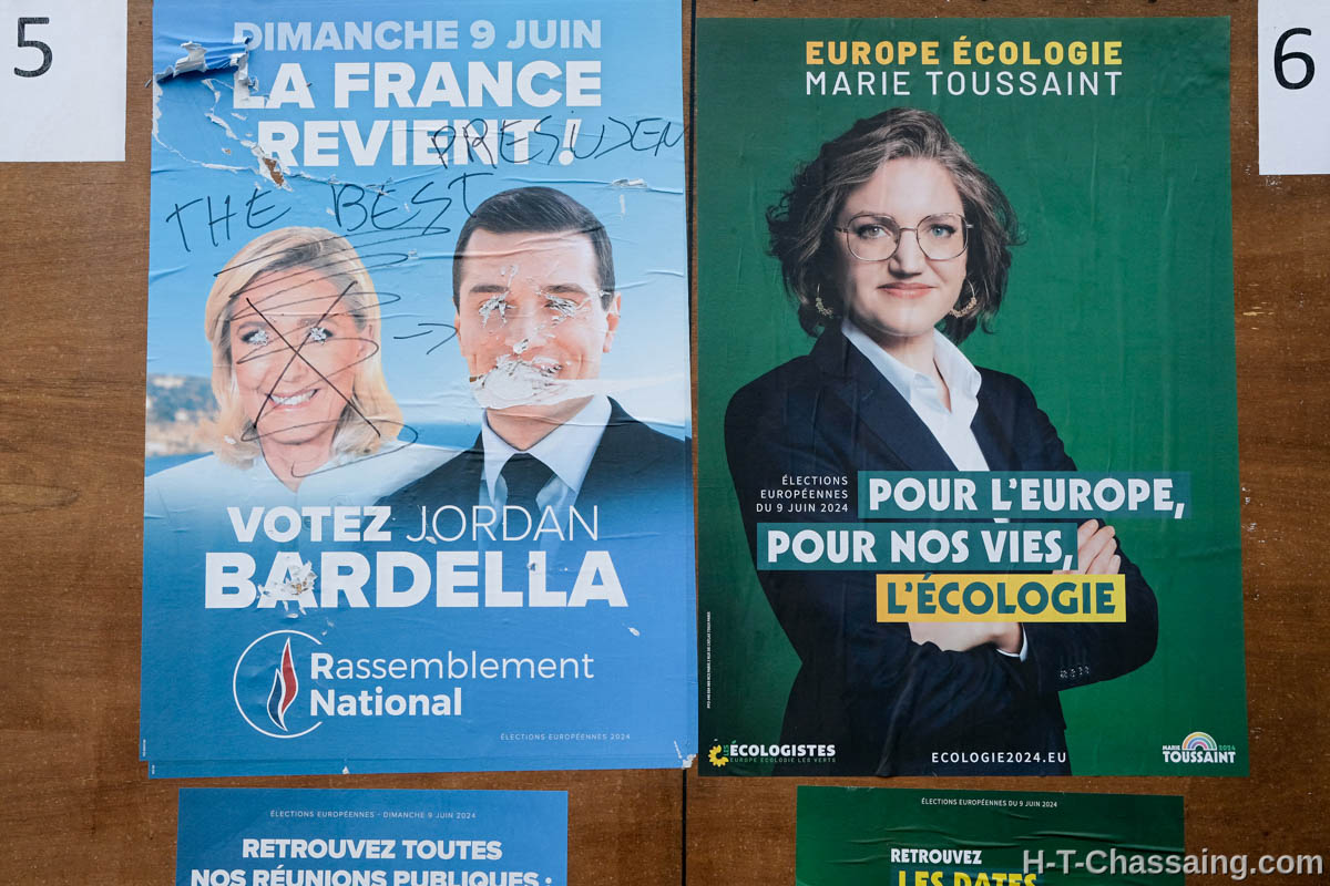 – Les affiches du parti d’extrême droite : « Le 9 juin avec Bardella – La France revient – L’Europe revit ! – Rassemblement national » et d’Europe Écologie Les Verts : « Justice Paix Écologie » avec Marie Toussaint.