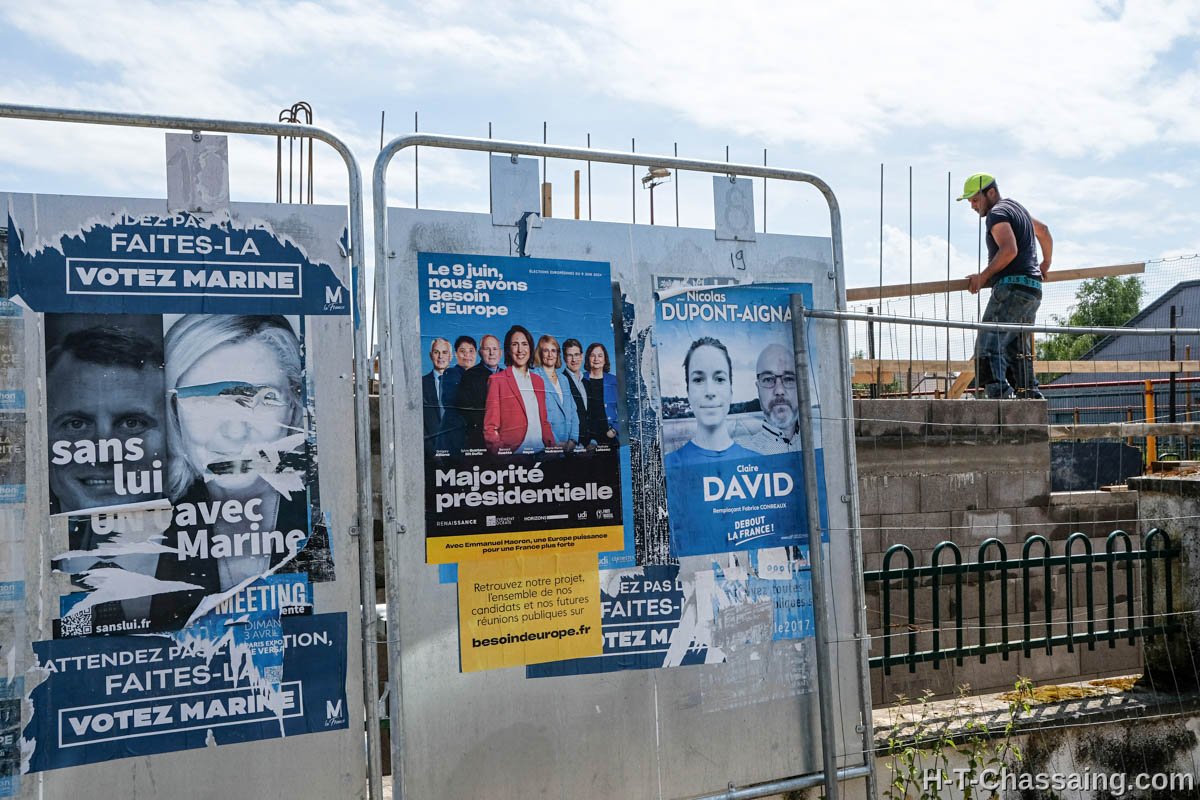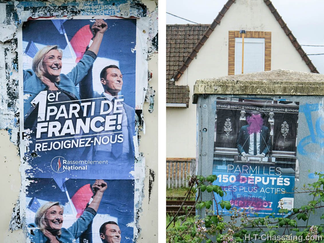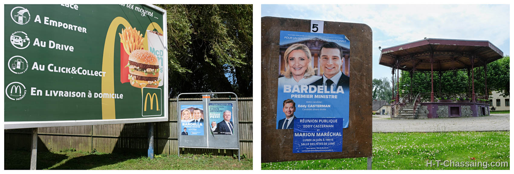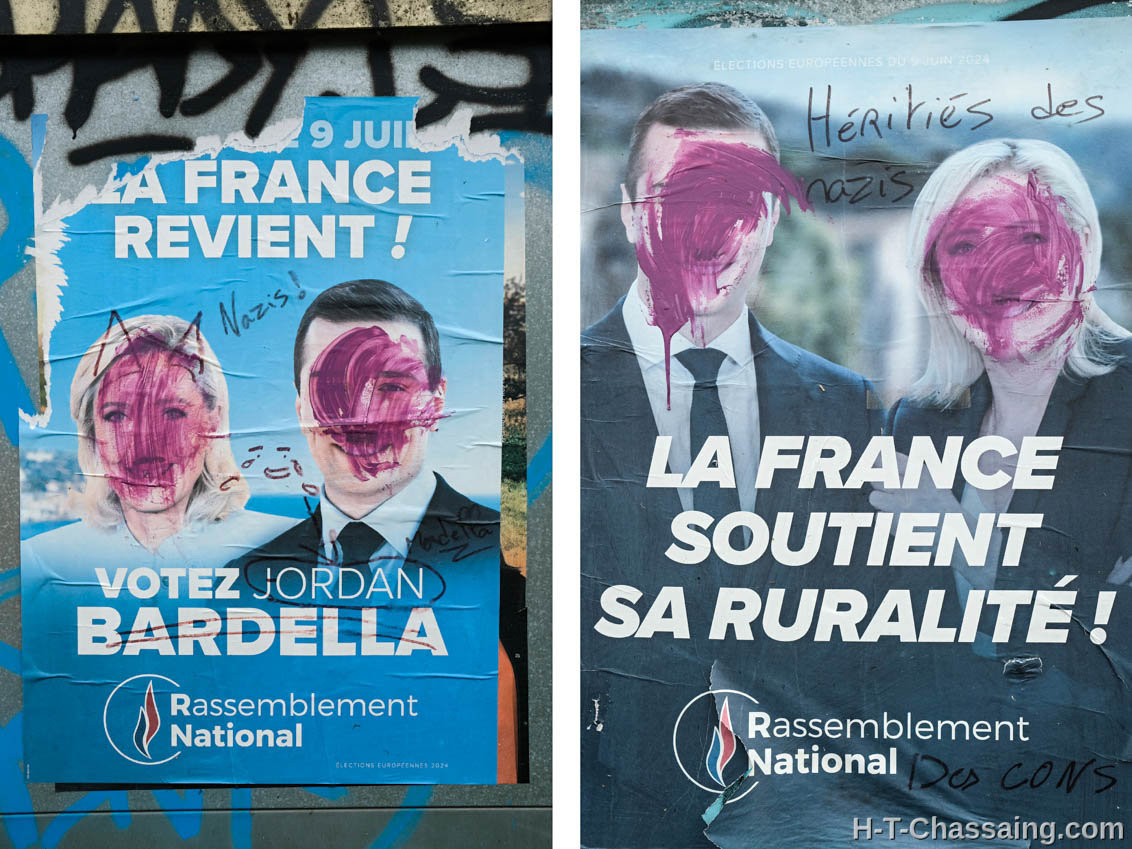 – Les affiches du parti d’extrême droite : « Le 9 juin avec Bardella – La France revient – L’Europe revit ! – Rassemblement national » et d’Europe Écologie Les Verts : « Justice Paix Écologie » avec Marie Toussaint.