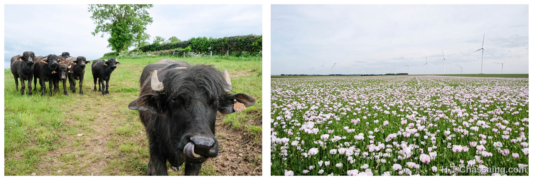 – Champ de pavot parmi des étendues de champs de céréales et de pommes de terre. Les gens du coin nous disent que cette culture est hautement surveillée par la police en raison de vols pour produire de la drogue. À la sortie de Champfleury. Marne, Grand Est. France – 8 Juin 2024.