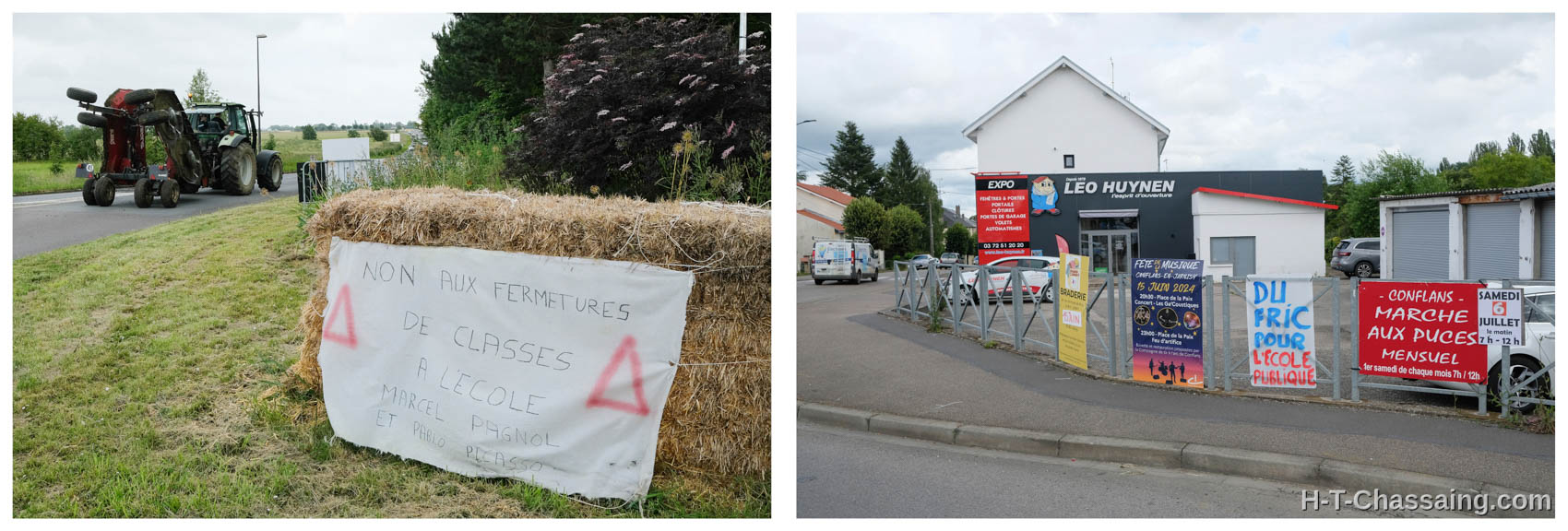 – « Non aux fermetures de classes à l’école Marcel Pagnol et Pablo Picasso ». Au rond-point qui fait face à la zone industrielle de Jarny-Giraumont.