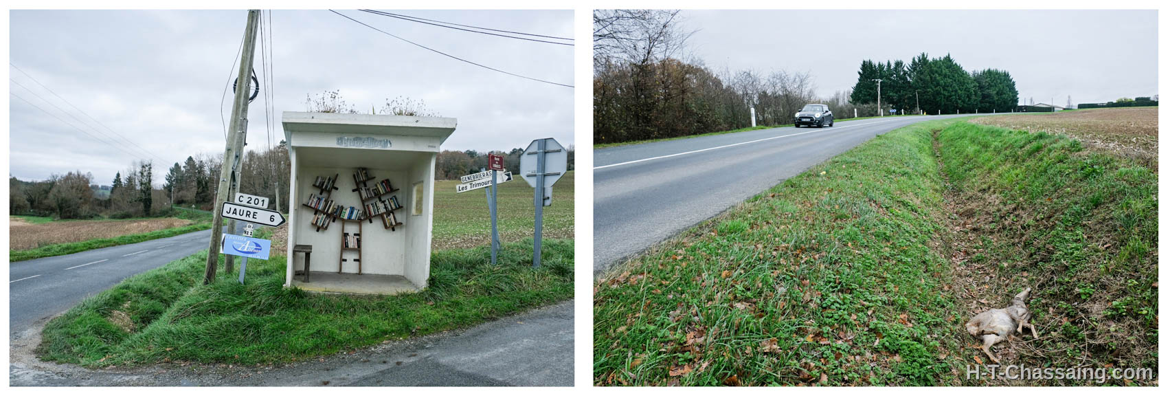 – Abri bus aménagé en boîte à livres. Près de Jaure. Dordogne, Nouvelle-Aquitaine. France – 9 Décembre 2024.