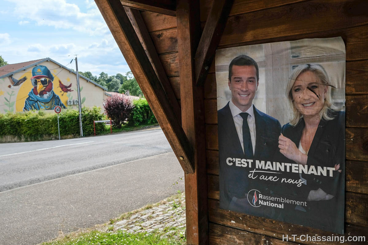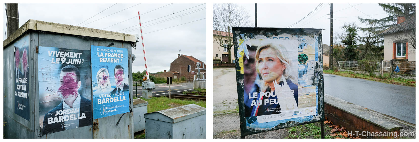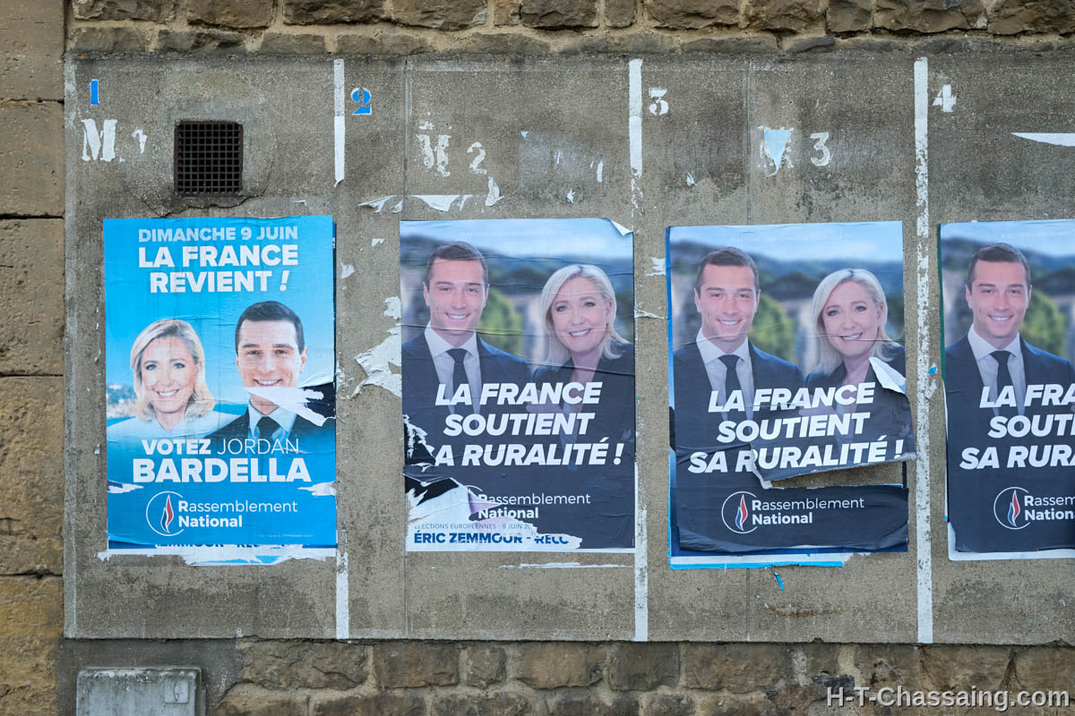 À l’occasion des élections européennes, deux types d’affiches du RN (ex FN : Front national), parti d’extrême droite, avec son ancienne présidente Marine Le Pen et le nouveau président (depuis 2022), Jordan Bardella. « Dimanche 9 juin – La France revient – L’Europe revit ! – Votez Jordan Bardella Rassemblement national » « La France soutient sa ruralité ». France – Juin 2024.
