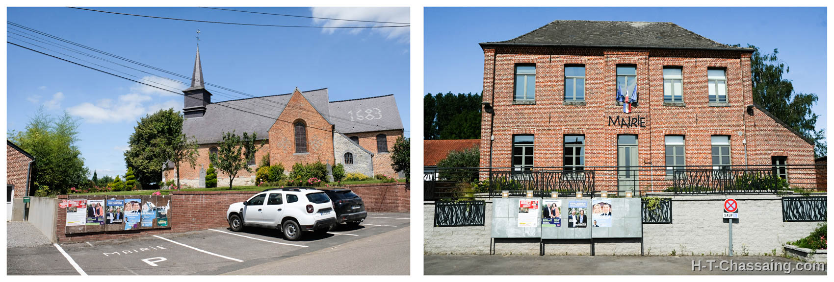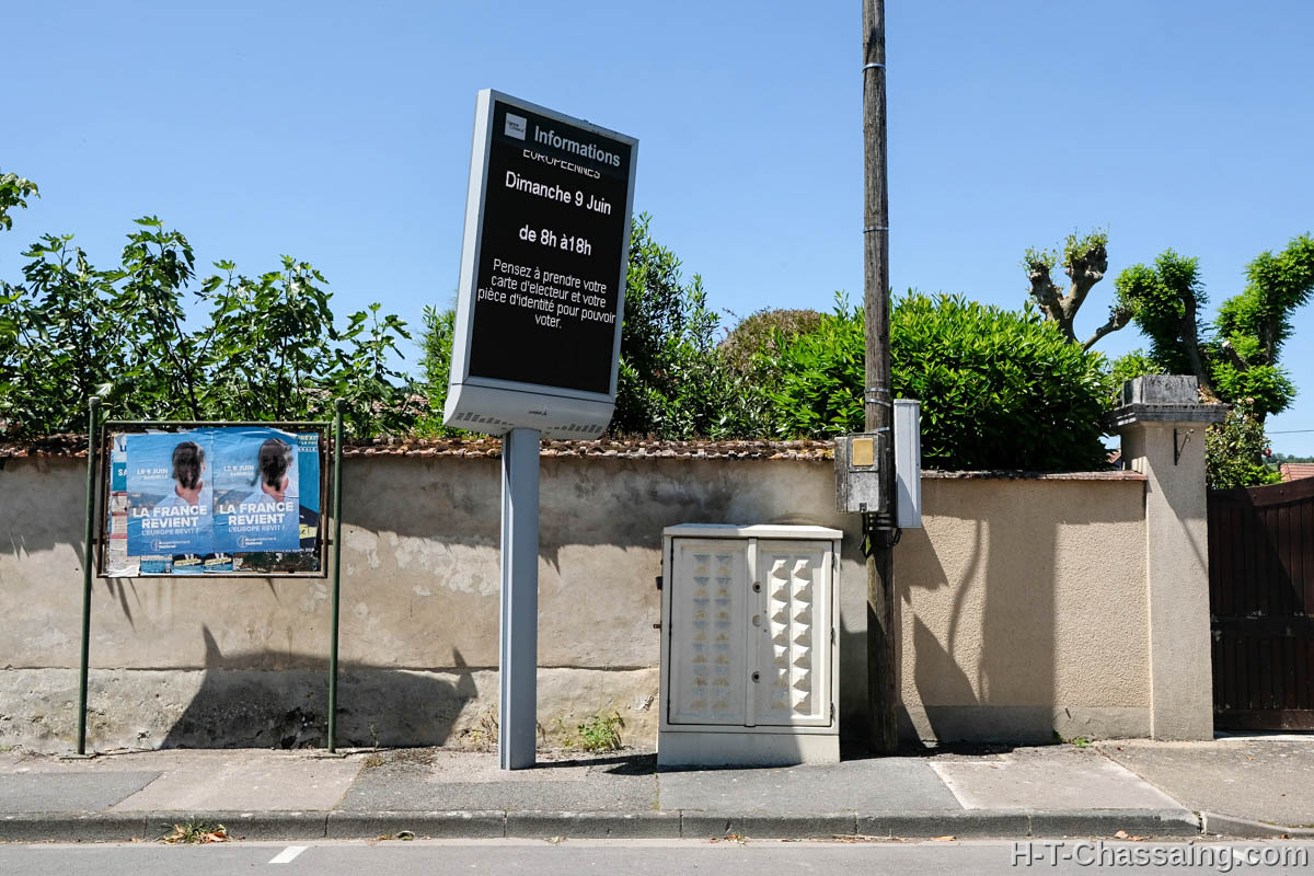 Panneaux électoraux devant l’église et devant la mairie. France – Juin 2024.