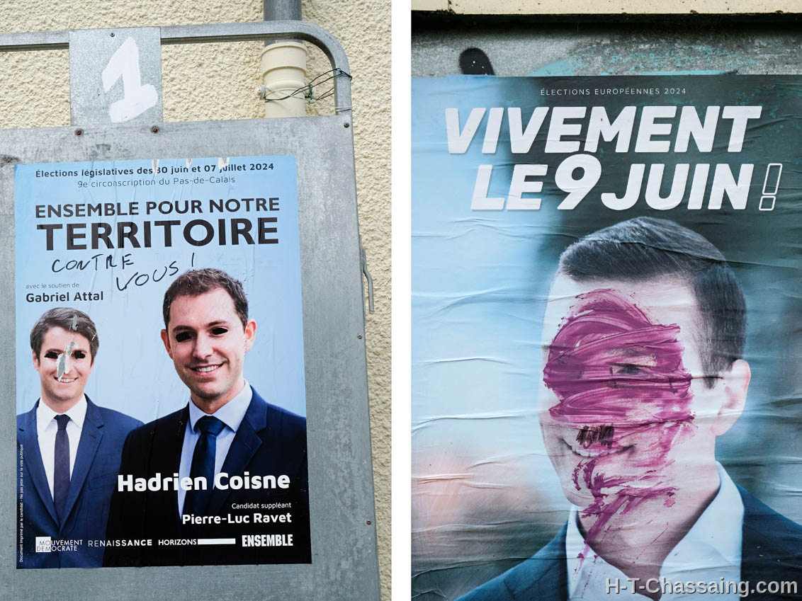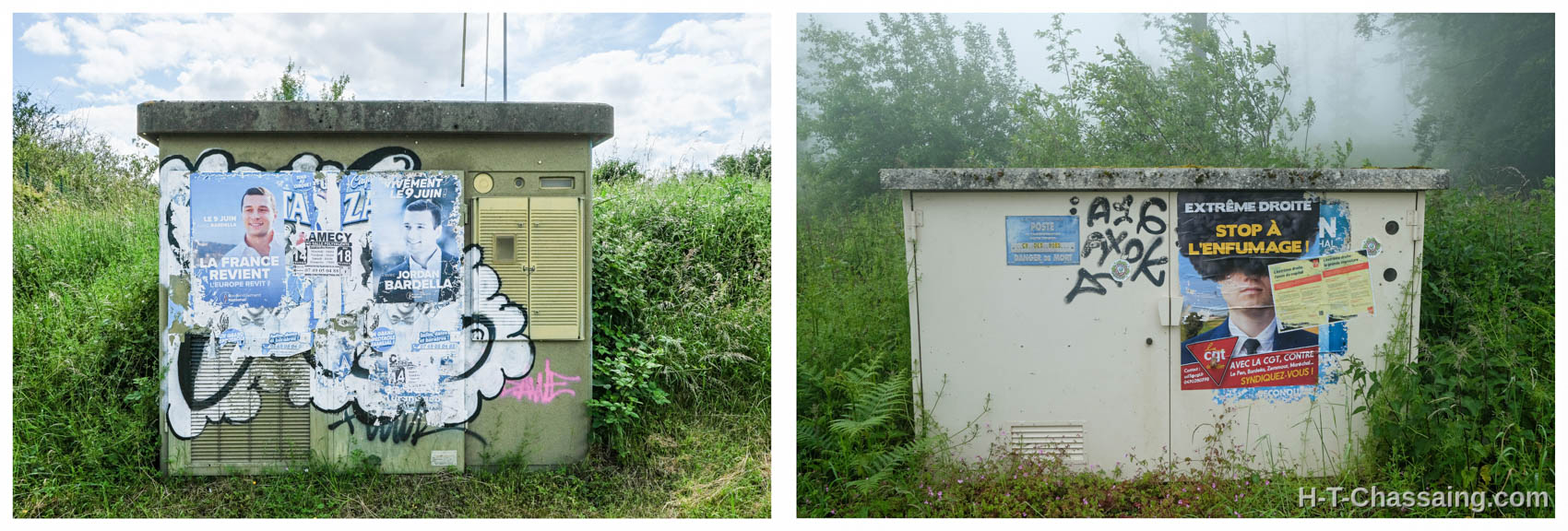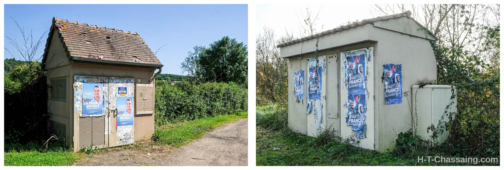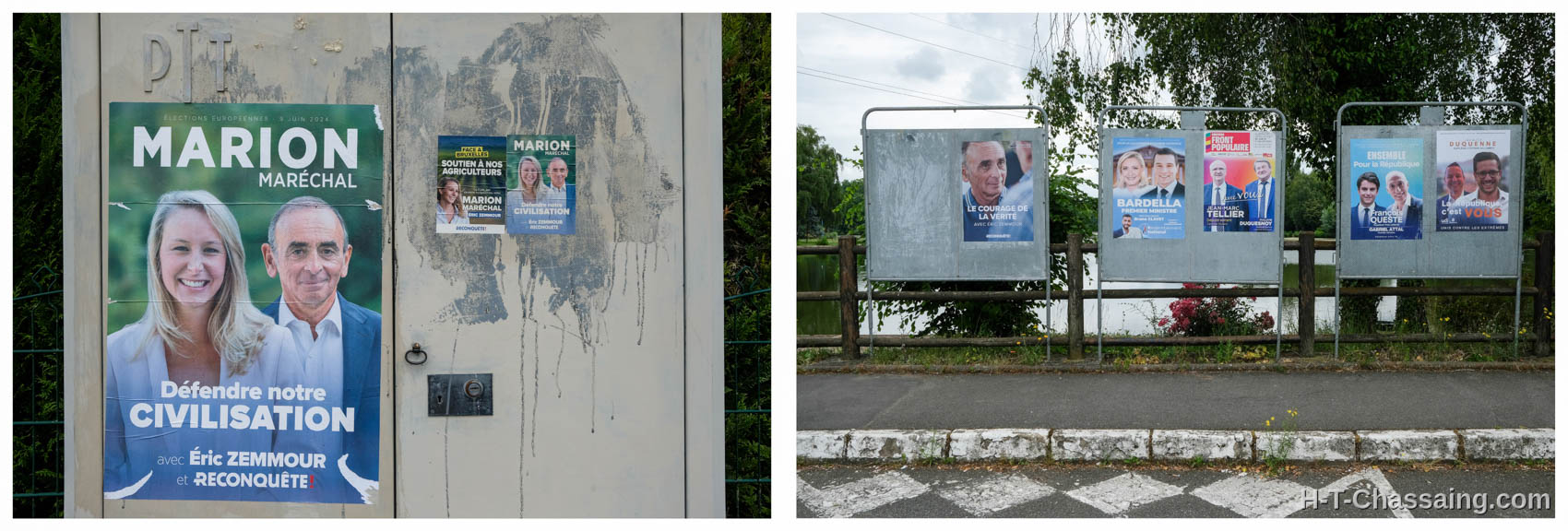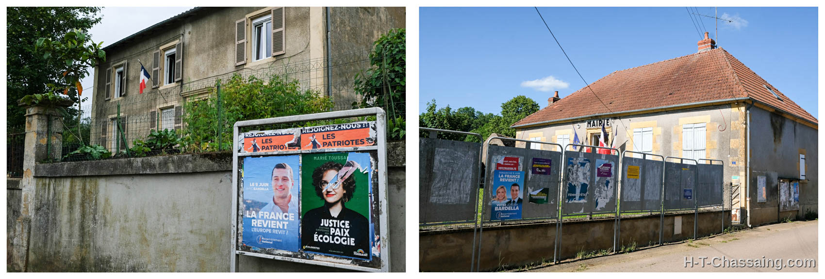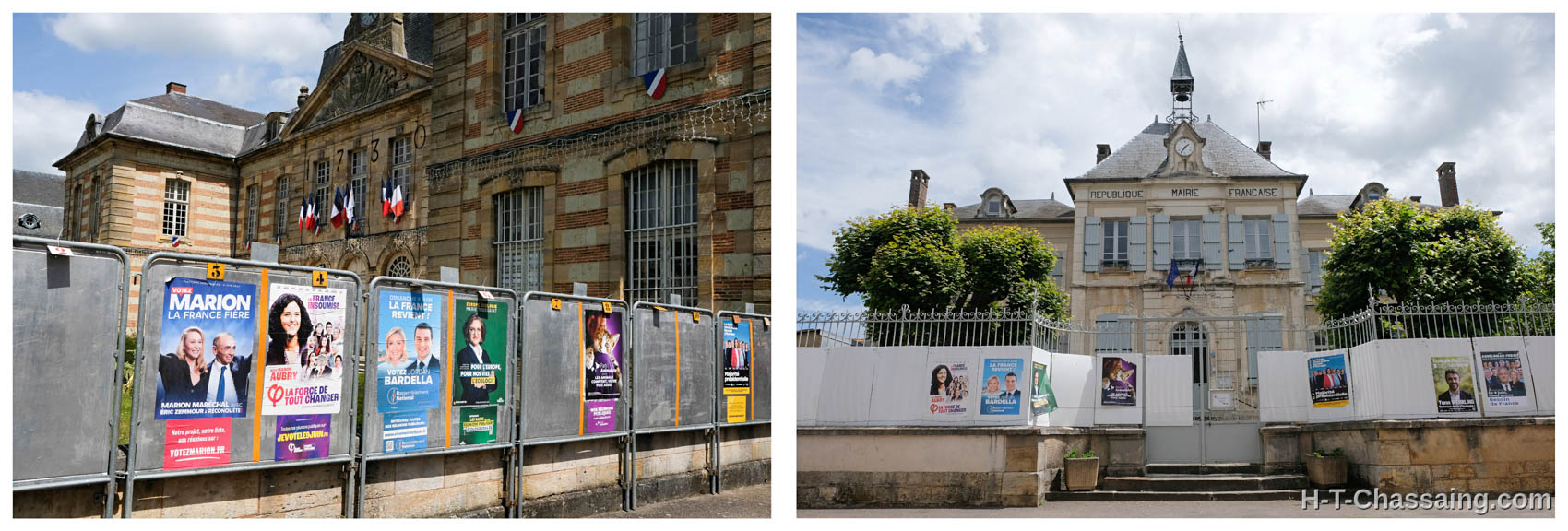 Panneaux électoraux devant deux mairies. France – Juin 2024.
