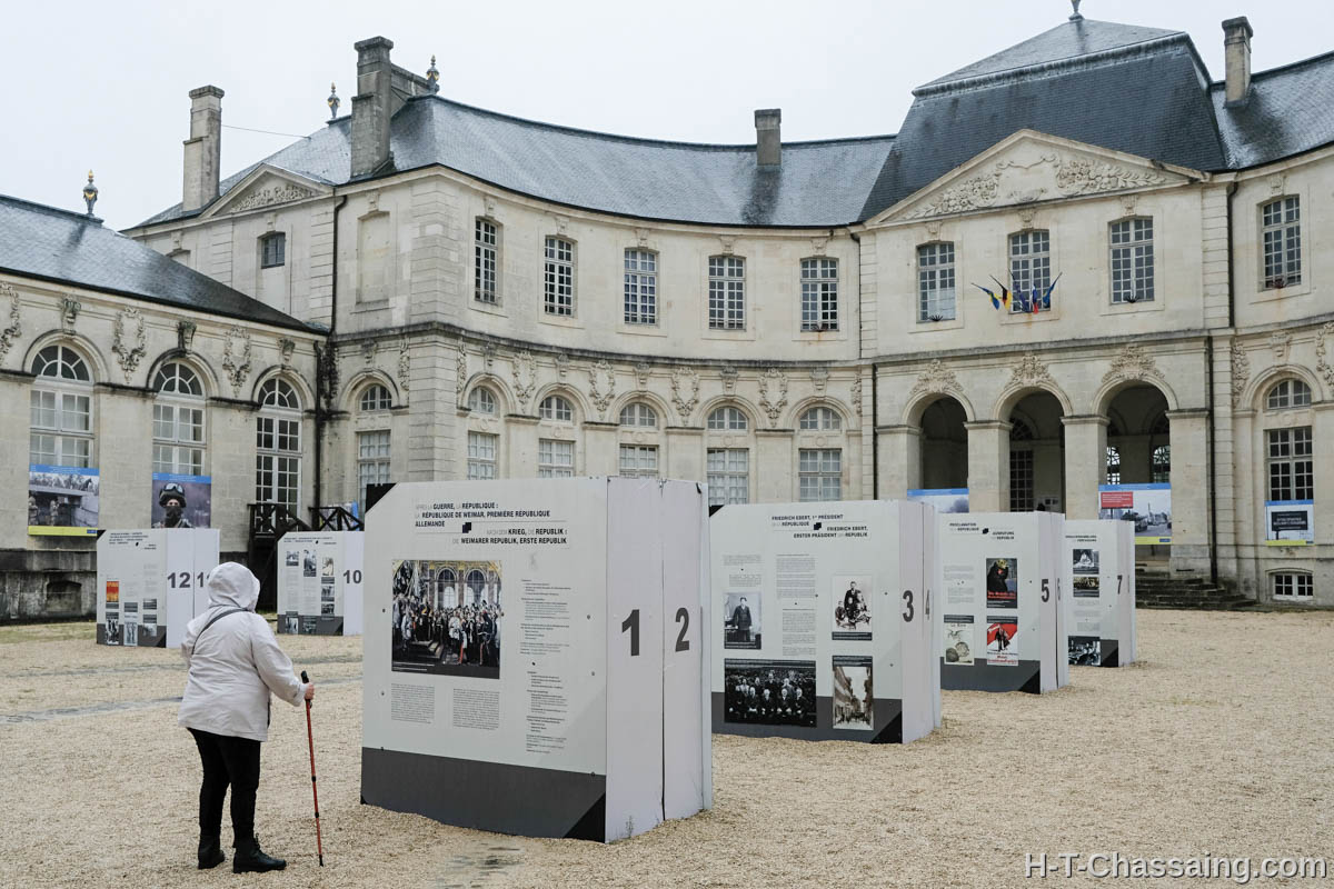 « Après la guerre, la République de Weimar : la République de Weimar, première république allemande ». Célèbre pour être la première du pays et aussi pour avoir nommé Adolf Hitler chancelier en 1933. Dans la cour du Centre Mondial de la Paix à Verdun, aux côtés d’une exposition sur les murs : « Kiev : Rapport d’une journée : le 8 mars 202 » ». Verdun. Meuse, Grand Est. France – 14 Juin 2024.