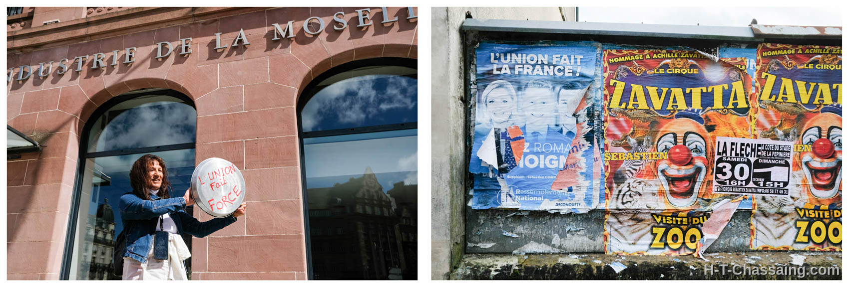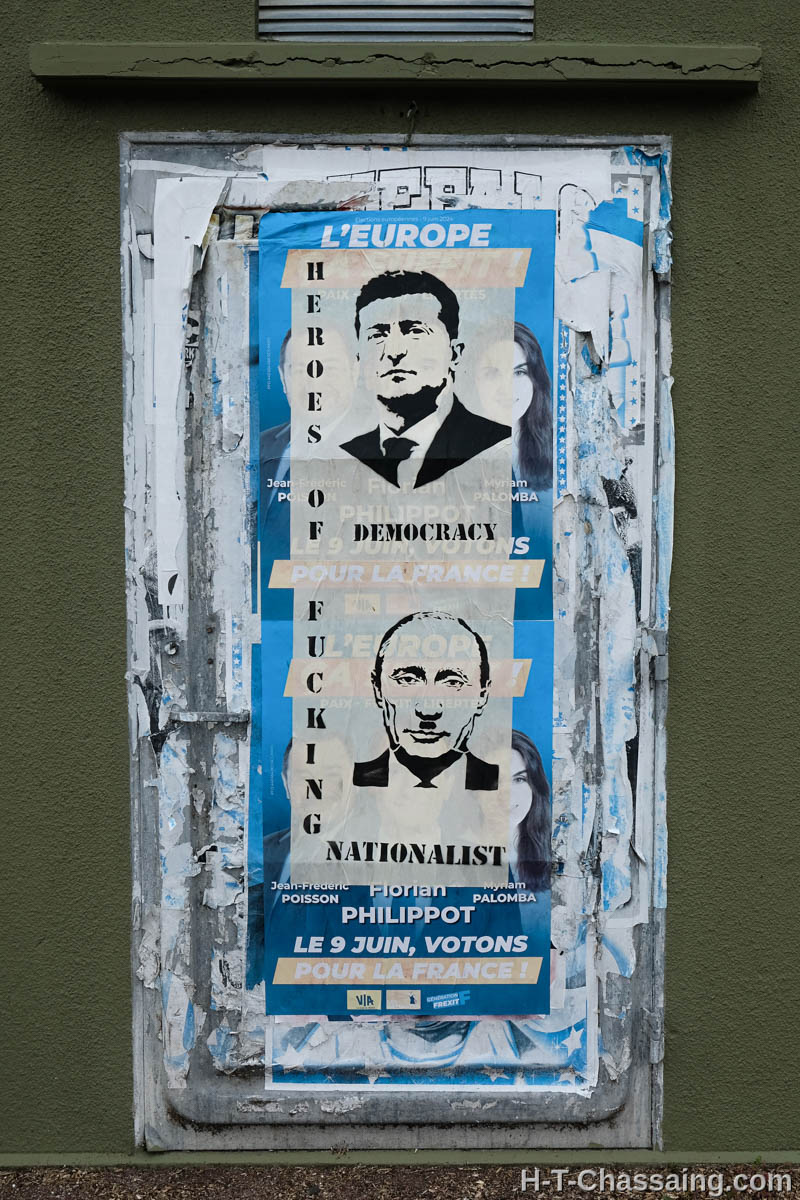 Triple affichage sauvage, sur un panneau électrique, dans une rue de Sangatte. Un message publicitaire d’un cirque avec des clowns est recouvert de l’affiche pour les élections européennes, « L’Europe ça suffit ! Le 9 juin, votons pour la France ! » du parti d’extrême droite de Florian Philippot (LP-Les Patriotes), elle-même recouverte par ce collage de portraits noir et blanc. Sangatte. Pas-de-Calais, Hauts-de-France. France – 8 Juillet 2024.