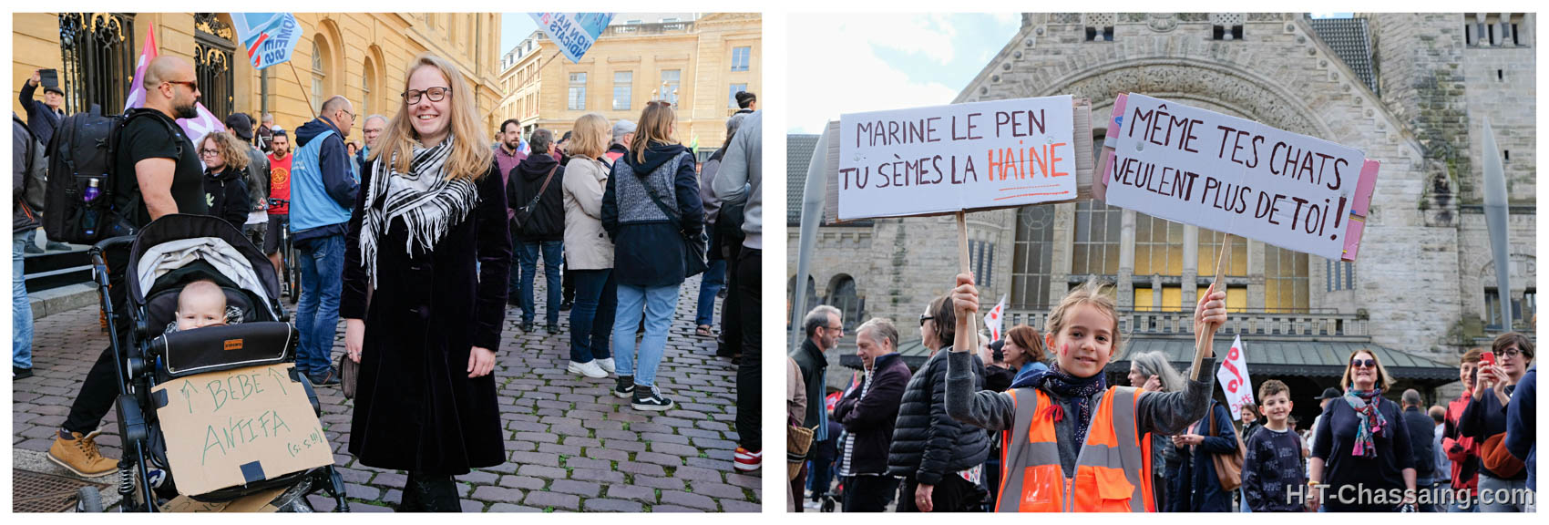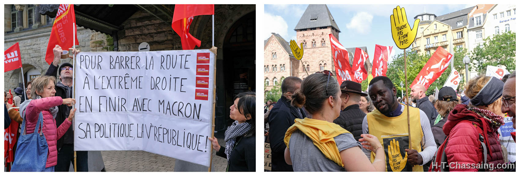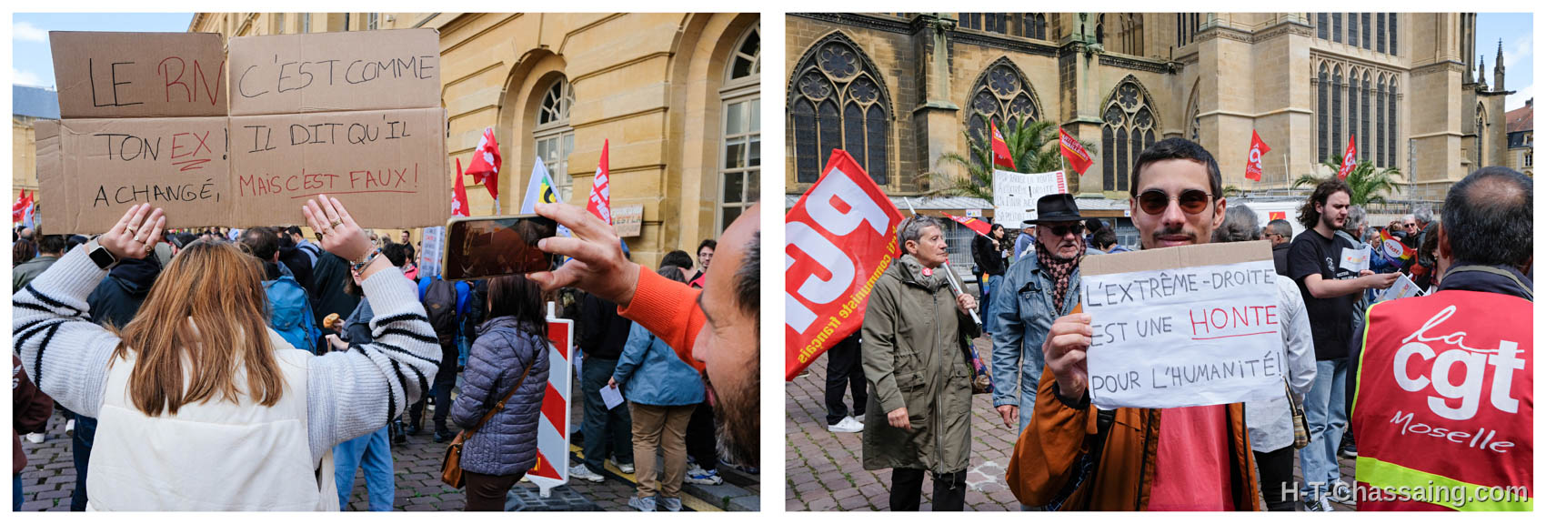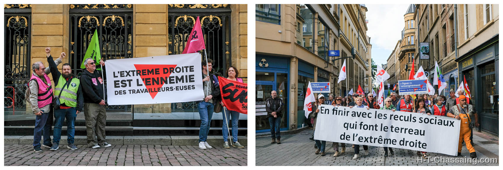– Drapeau du Parti communiste français, chasuble de la cgt Moselle et ce panneau : « L’extrême droite est une honte pour l’humanité ! »