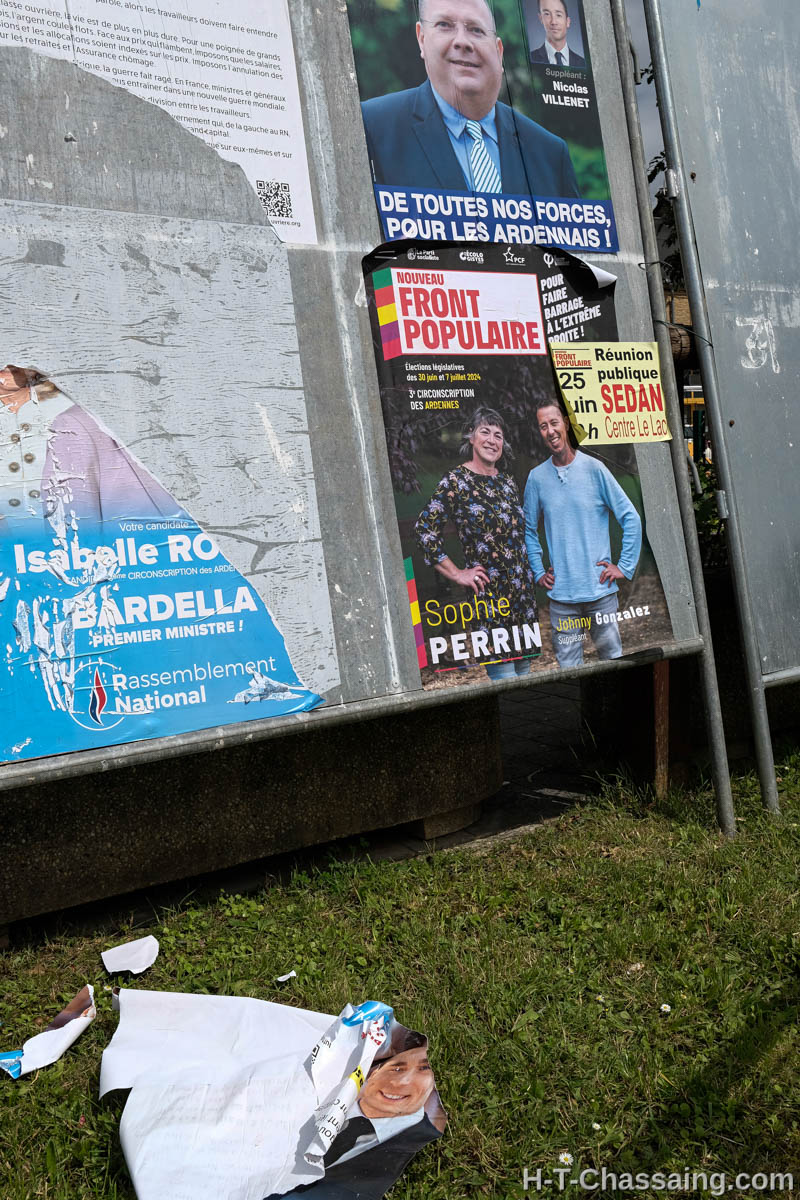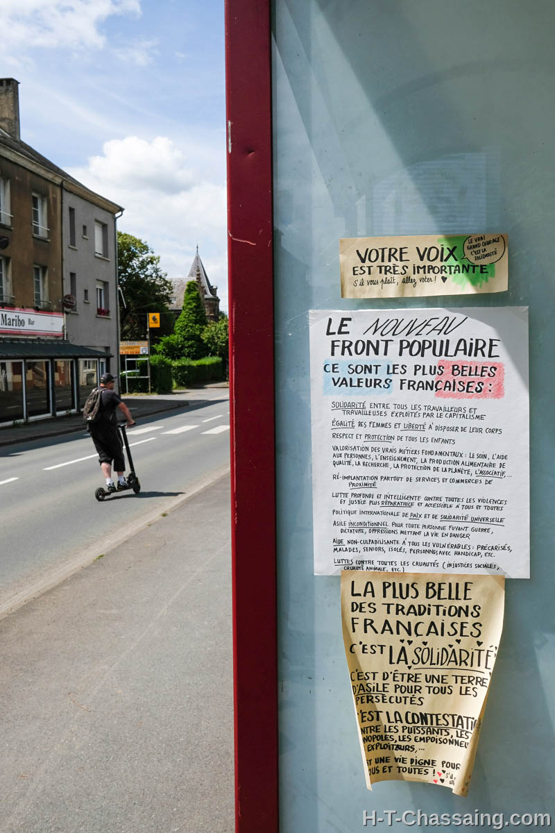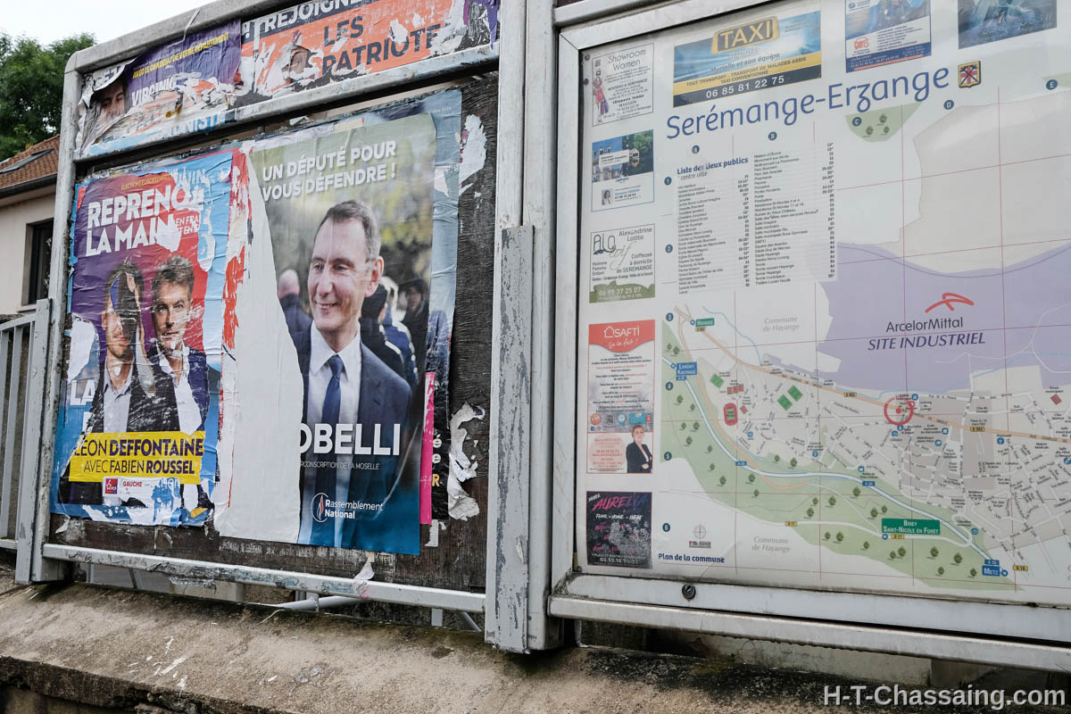 – Affiches électorales devant la mairie dont le fronton affiche 1730. On nous dit que le roi serait passé par là lorsqu’il s’enfuyait par la route de Varennes (qui se trouve plus loin). Sainte-Menehould. Marne, Grand Est. France – 13 Juin 2024.