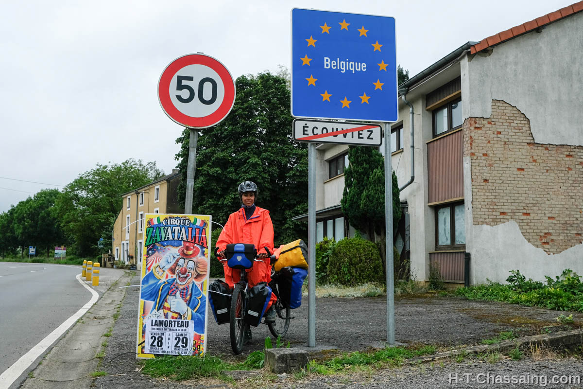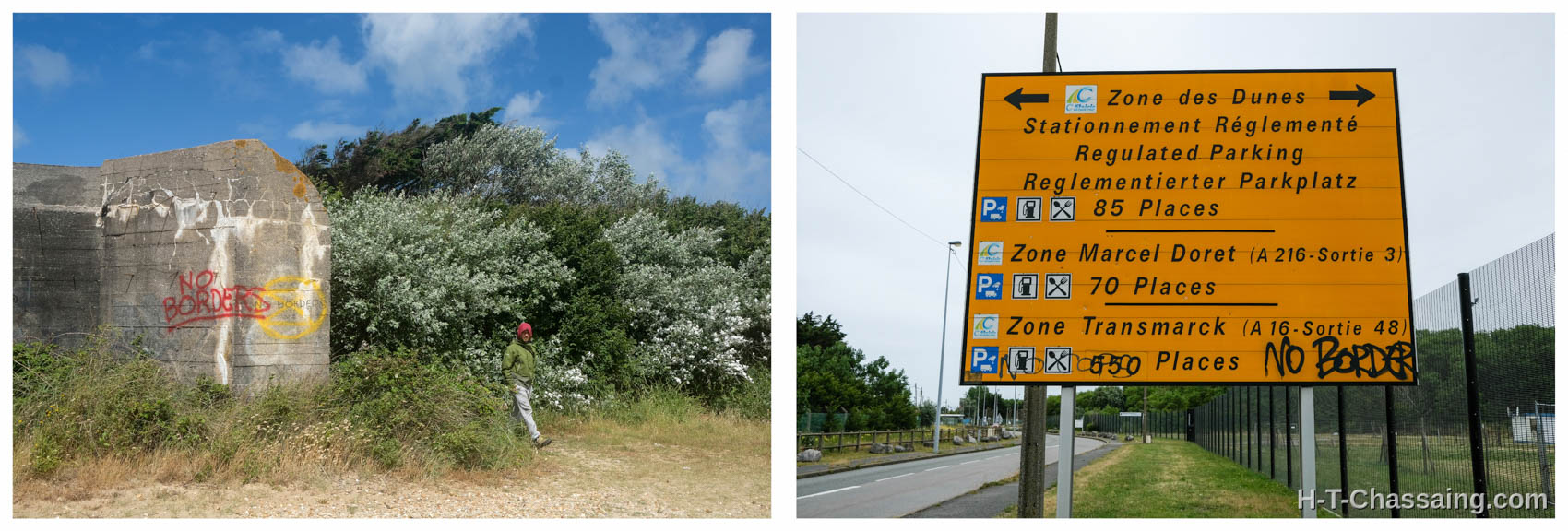 – « No borders » (Pas de frontières). Nous sommes non loin de Calais et d’ici aussi les migrants tentent de traverser la Manche pour atteindre le Royaume-Uni. Sur la route menant à Boulogne-sur-Mer. Ambleteuse.