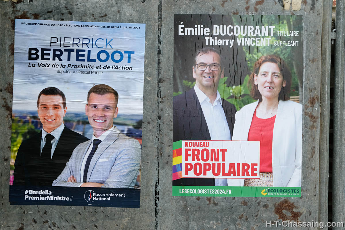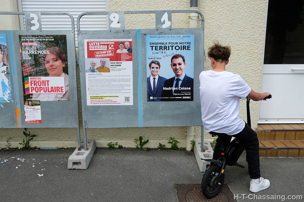 Panneau électoral avec les affiches du NFP (Nouveau Front populaire « Pour faire barrage à l’extrême droite ! »), de Lutte ouvrière « le camp des travailleurs », parti d’extrême gauche ainsi que l’affiche électorale de Ensemble, le parti de l’ancienne majorité présidentielle d’Emmanuel Macron : « Élections législatives des 30 juin et 07 juillet 2024 – 9e circonscription du Pas-de-Calais – Ensemble pour notre territoire avec le soutien de Gabriel Attal ». Pas-de-Calais, Hauts-de-France. France – 1er Juillet 2024.