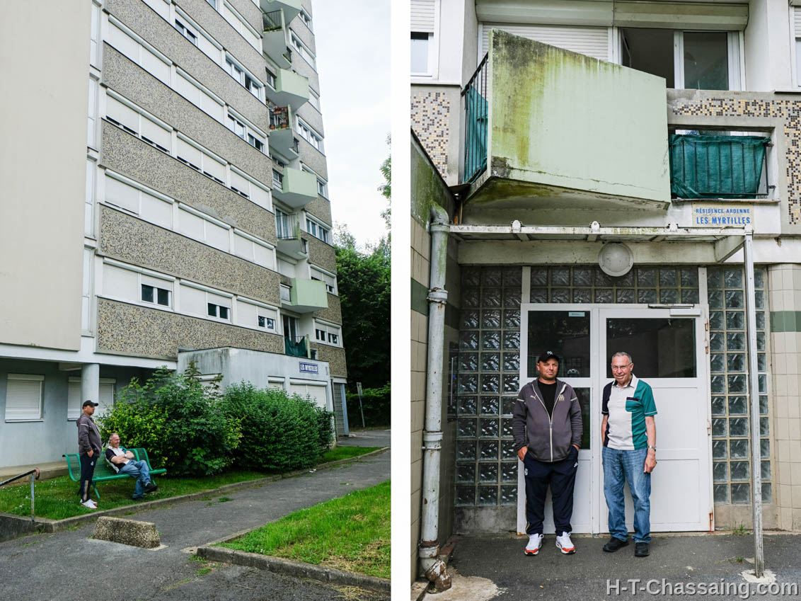 – Passage de la tondeuse devant une ancienne boulangerie. Le béret que porte Serge est celui du 27e Bataillon des Chasseurs Alpins (BCA) dont l’insigne est le Tigre. Ce vieux monsieur nous raconte avec émotion que durant la guerre de 1914, Clémenceau a décoré le bataillon de la Légion d’honneur, d’où le tigre. Marne, Grand Est. France – 8 Juin 2024.