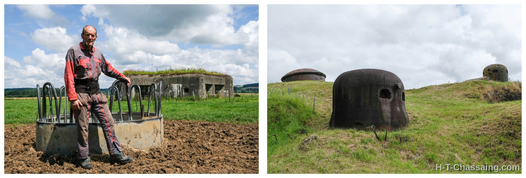 – « Casemate » près de la ferme de cet agriculteur. N’ayant plus les moyens d’entretenir tous ces bâtiments historiques, l’État leur a vendu cette parcelle où il est situé. Il nous raconte une histoire sur le grand-père de la famille. « Après la guerre, un cheval a posé le pied sur une mine. Les 2 chevaux sont morts et le grand-père qui tenait la charrue a eu le dessus de la main arrachée. » Après Villy. Les Ardennes, Grand Est. France – 23 Juin 2024.