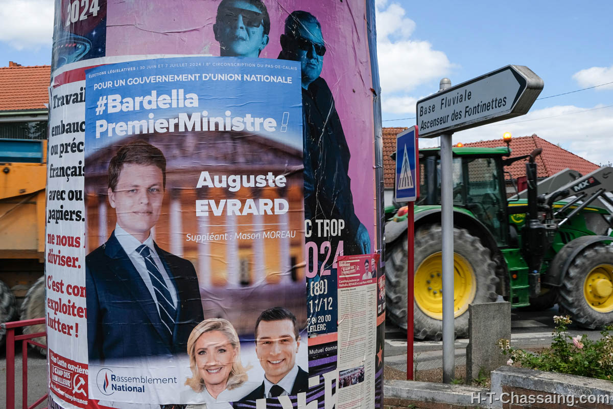 « Élections législatives – 30 juin et 7 juillet 2024 – 8e circonscription du Pas-de-Calais – Pour un gouvernement d’union nationale #BardellaPremierMinistre ! – Auguste Evrard – Suppléant : Mason Moreau – Rassemblement National ». Pas-de-Calais, Hauts-de-France. France – 4 Juillet 2024.