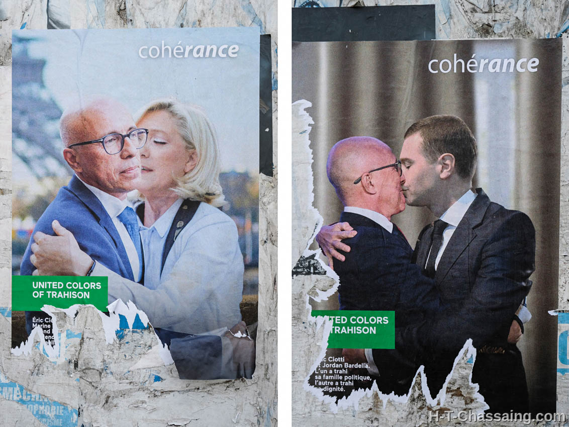 – « cohérance – United Colors of Trahison ». À gauche Éric Ciotti avec Marine Le Pen dans cette parodie de publicité pour la marque de vêtements Benetton. Le président du parti de droite Les Républicains a décidé de se rapprocher du parti d’extrême droite du Rassemblement national.