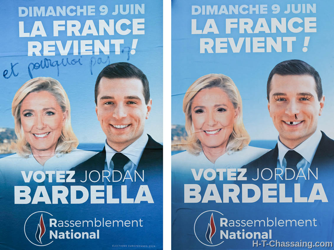 Graffiti « et pourquoi pas ? ». Et portraits défigurés sur ces affiches du parti d’extrême droite : « Dimanche 9 juin – La France revient ! Votez Jordan- Bardella – Rassemblement National. » France – Juin 2024.