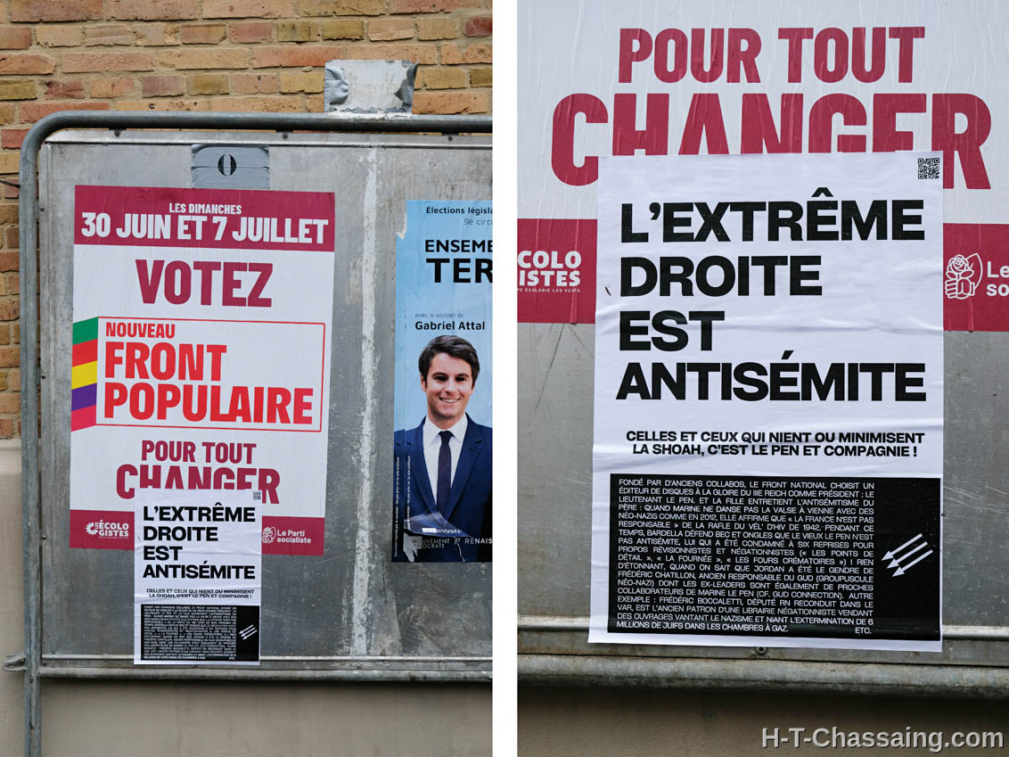 – Affichette « L’extrême droite est antisémite » rajoutée sur cette affiche électorale du NFP. « Les dimanches 30 juin et 7 juillet – Votez Nouveau Front populaire – Pour tout changer ». Le Nouveau Front populaire est composé du Parti socialiste, des Écologistes, du Parti communiste français et de la France Insoumise. Ces partis ont réussi à s’unir en urgence pour faire barrage au RN d’extrême droite à l’occasion des élections législatives convoquées par surprise par le président Emmanuel Macron.