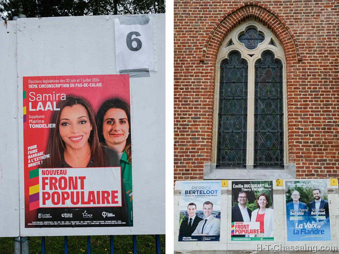 – Devant l’église, panneaux électoraux pour les législatives des 30 juin et 7 juillet 2024. Ici les affiches du RN, du NFP et de La voix de la Flandre. France – Juillet 2024.