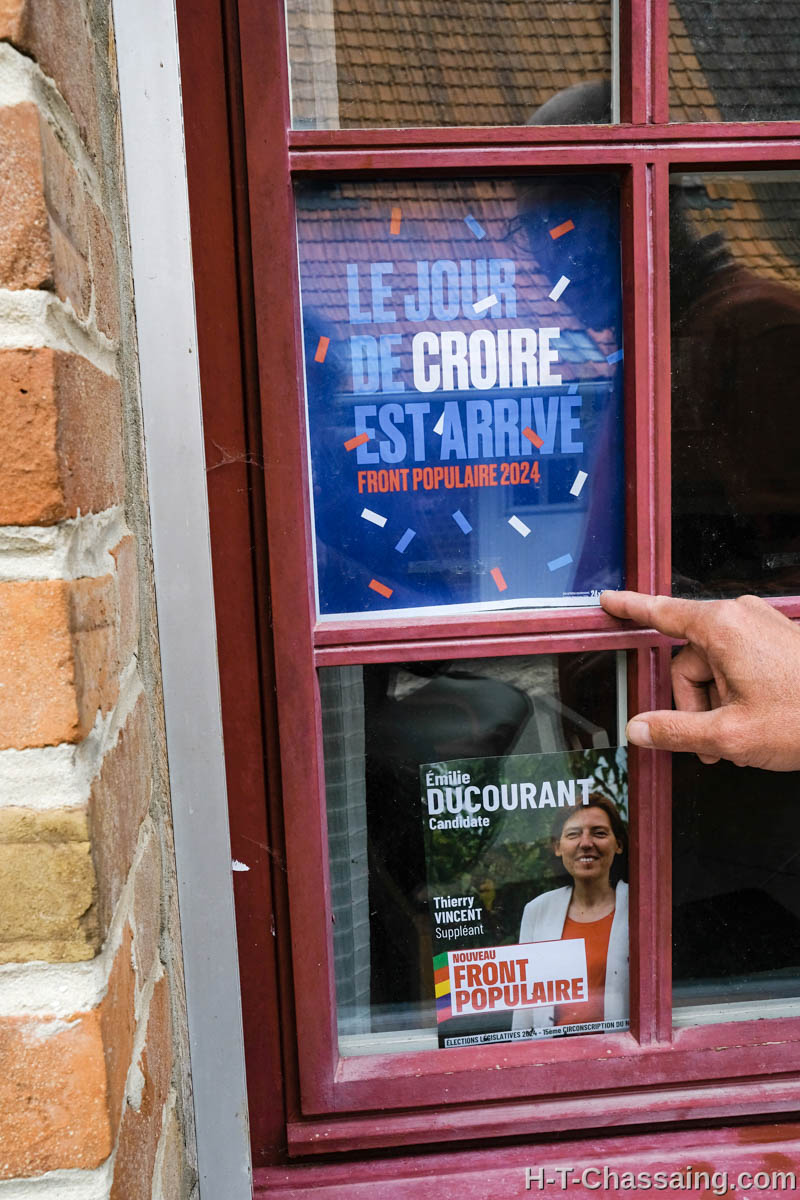 Affichettes électorales à la fenêtre d’une maison : « Le jour de croire est arrivé – Front populaire 2024 » « Émilie Ducourant Candidate – Thierry Vincent Suppléant – Nouveau Front populaire ». Mobilisation même au niveau des particuliers à l’occasion des élections législatives surprises convoquées à la suite des élections européennes qui venaient juste d’avoir lieu. Sainte-Marie-Cappel. Nord, Hauts-de-France. France – 2 Juillet 2024.