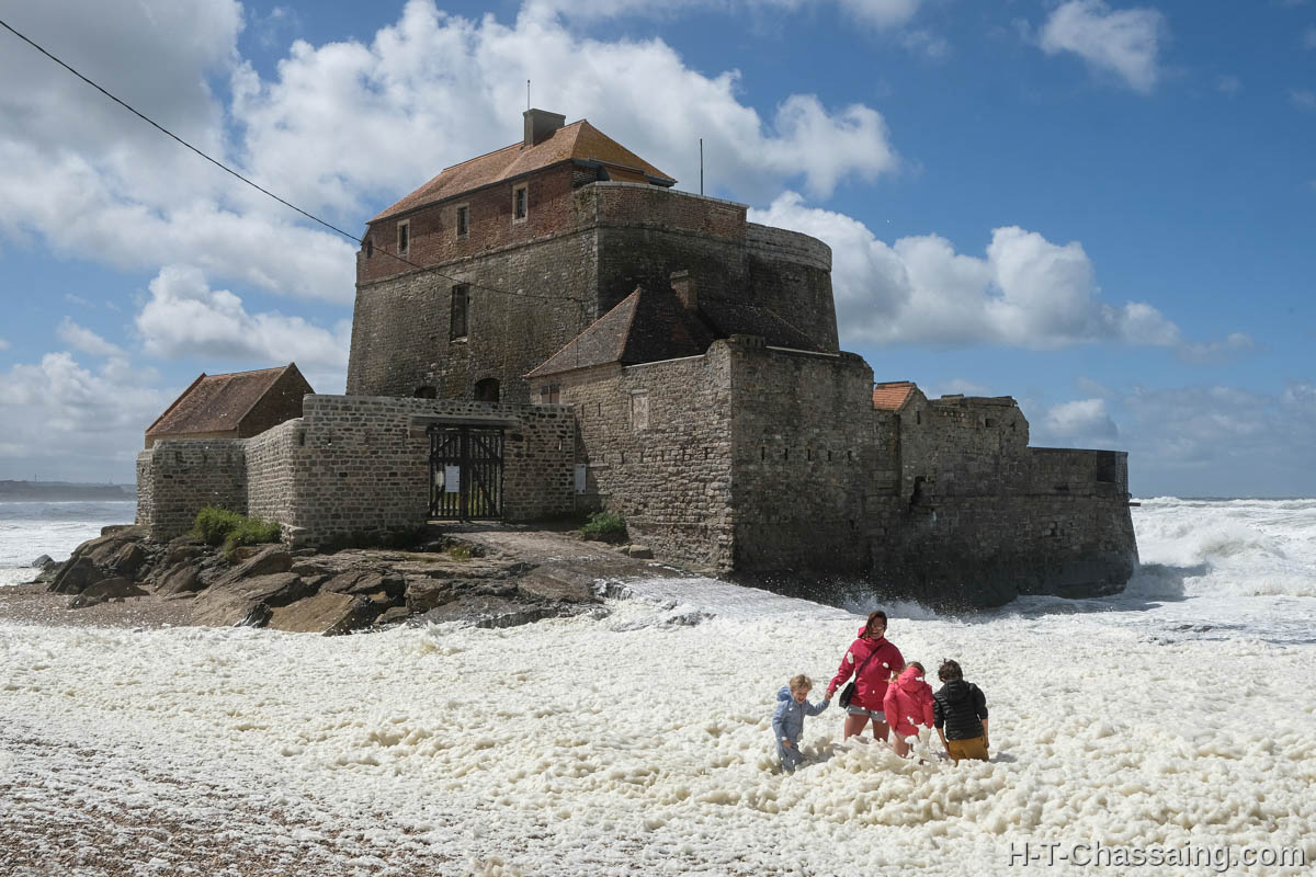 ‘Bain moussant’ dans les vagues pour cette famille devant le Fort d’Ambleteuse. Pas-de-Calais, Hauts-de-France. France – 6 Juillet 2024.