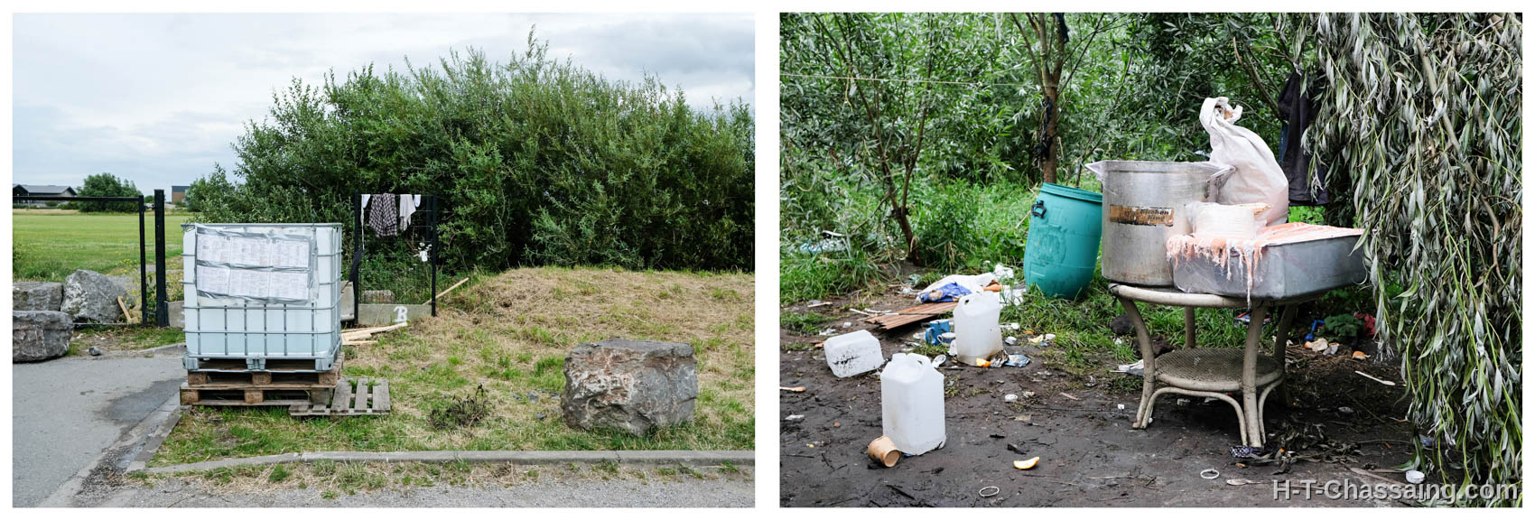 Stock d’eau dans cette cuve, linge qui sèche et côté cuisines. Près du campement avec tentes des migrants qui attendent, avant la tentative de traversée de la Manche en direction du Royaume-Uni. Calais. Pas-de-Calais, Hauts-de-France. France – 8 Juillet 2024.