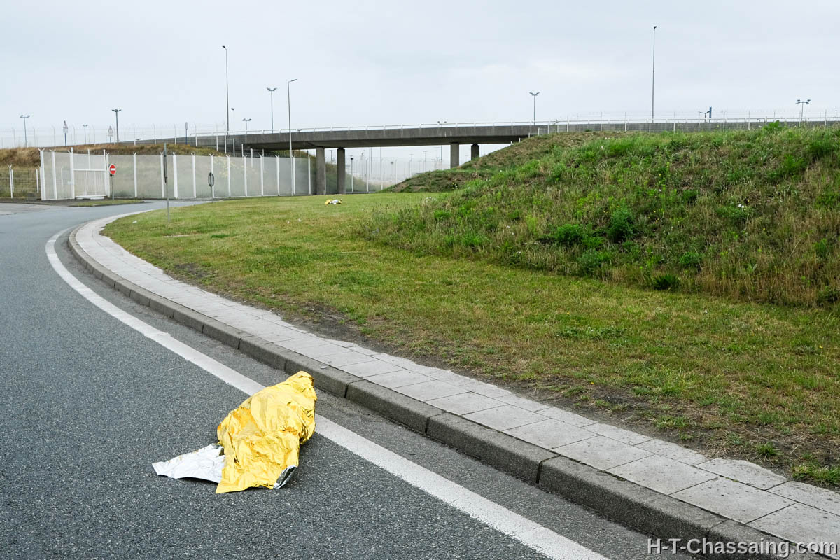 Couverture de survie abandonnée par les migrants qui essayent de traverser la Manche en direction du Royaume-Uni. Près du Terminal international d’où partent les ferries. Calais. Département du Pas-de-Calais, Hauts-de-France. France – 9 Juillet 2024.