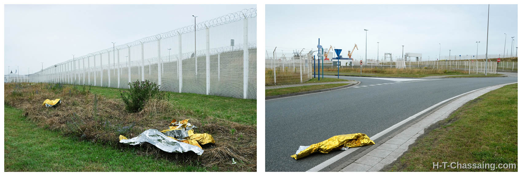 Couvertures de survie au pied des hautes clôtures blanches qui doivent empêcher de passer les migrants candidats à la traversée de la Manche, en direction du Royaume-Uni. En arrière-plan, on aperçoit les grues et les infrastructures du port. Calais. Département du Pas-de-Calais, Hauts-de-France. France – 8 Juillet 2024.