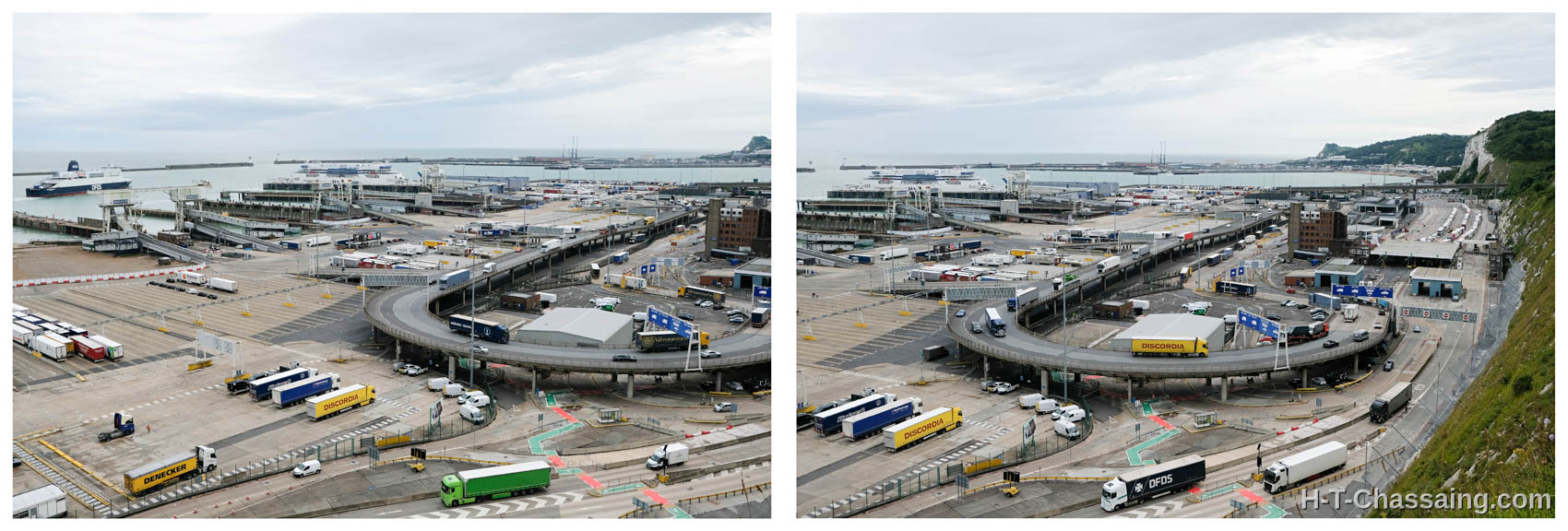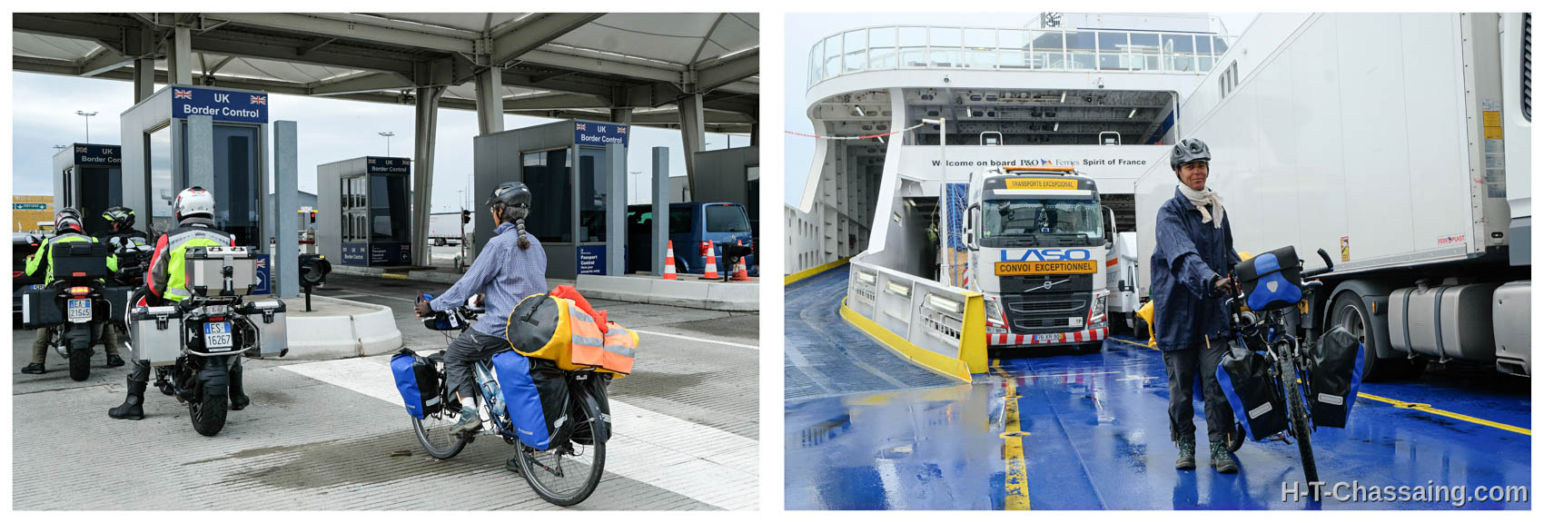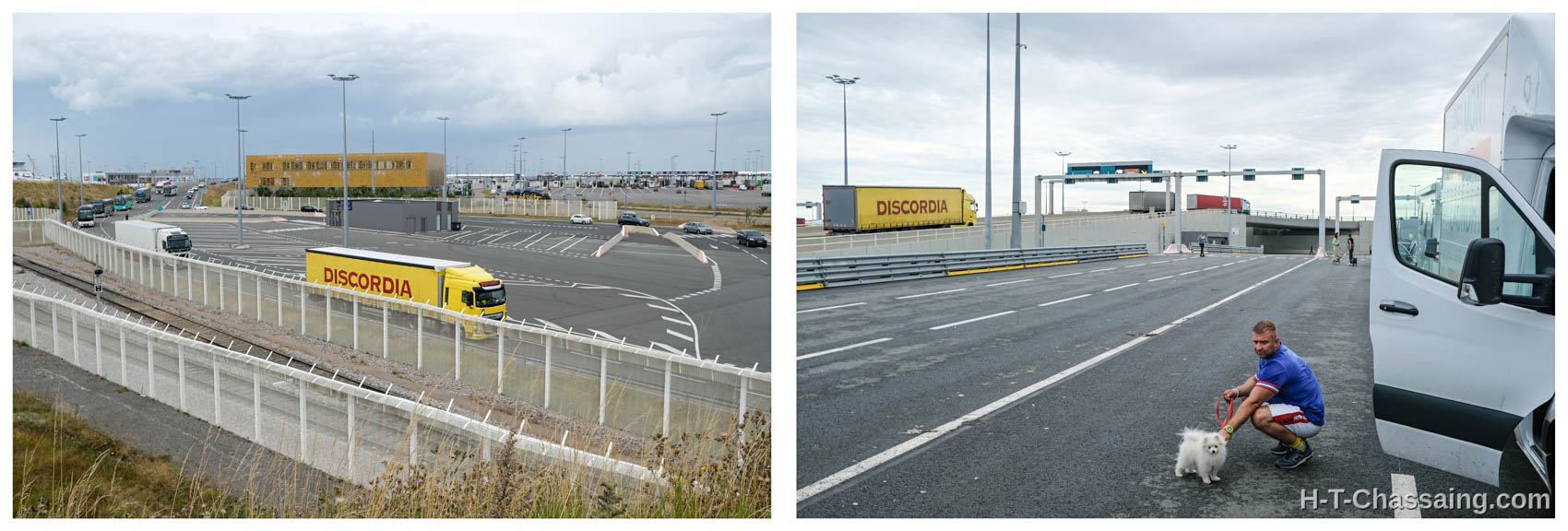 – Devant les camions et sous la pluie, Hélène s’apprête à débarquer à Douvres. Angleterre. Royaume-Uni – 9 Juillet 2024.