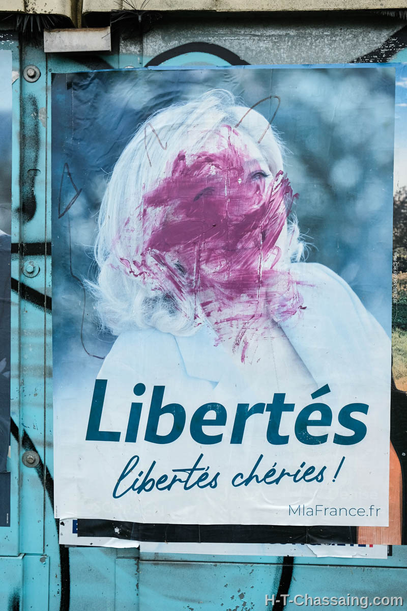 « Libertés libertés chéries ! – MlaFrance.fr ». Aucun nom de parti ni de logo sur cette affiche barbouillée du Rassemblement National, le parti d’extrême droite, avec le portrait souriant de son ancienne présidente Marine Le Pen. Strazeele. Nord, Hauts-de-France. France – 2 Juillet 2024.