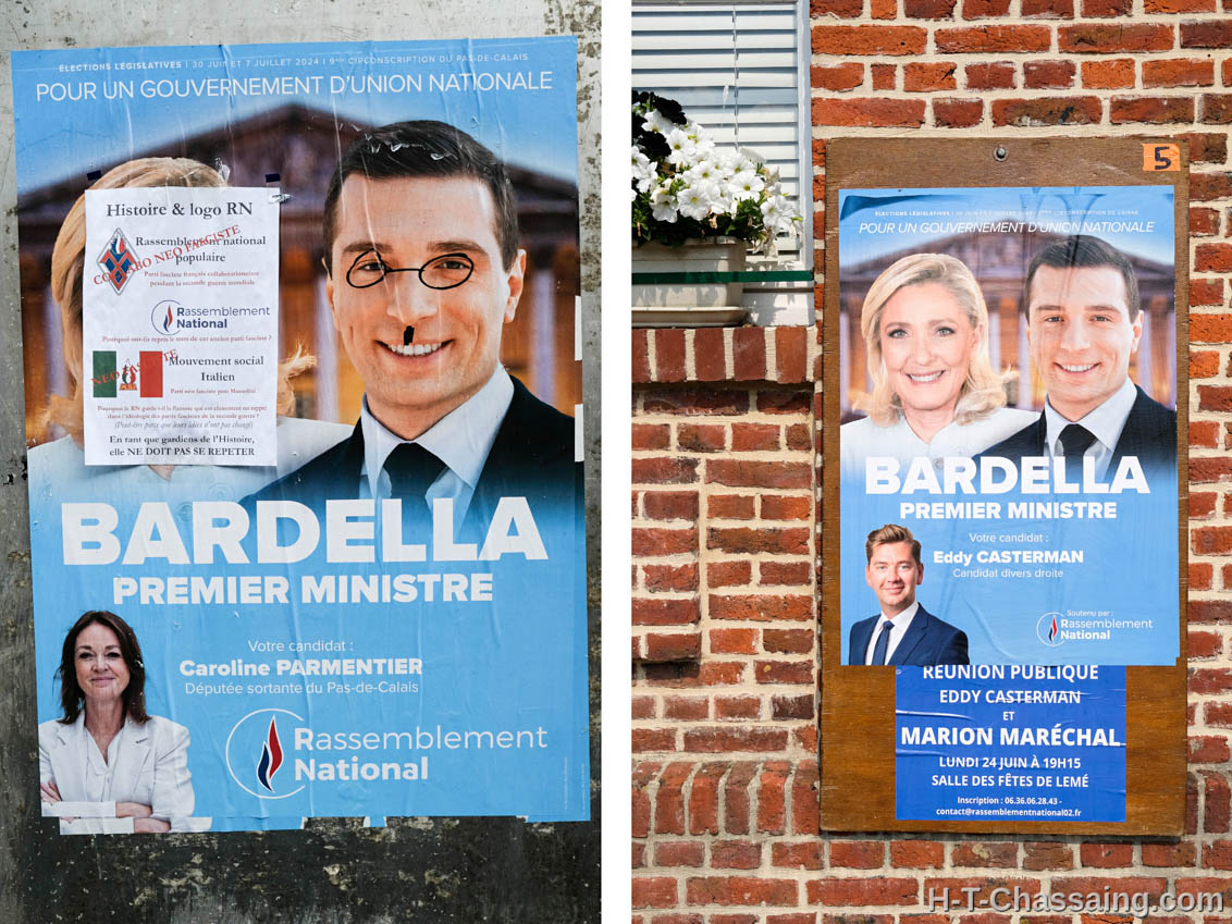 Le bandeau placardé sur l’affiche électorale du Rassemblement national annonce une réunion commune : « Réunion publique Eddy Casterman et Marion Maréchal Lundi 24 juin… ». Marion Maréchal qui a été exclue de l’autre parti d’extrême droite, Reconquête, à cause de ses velléités d’alliance avec le RN. « Élections législatives des 30 juin et 7 juillet 2024 / 9ème circonscription du Pas-de-Calais – Pour un gouvernement d’union nationale – Bardella Premier ministre – Votre candidat : Eddy Casterman – divers droite – Rassemblement National ». France – 27 Juin 2024.