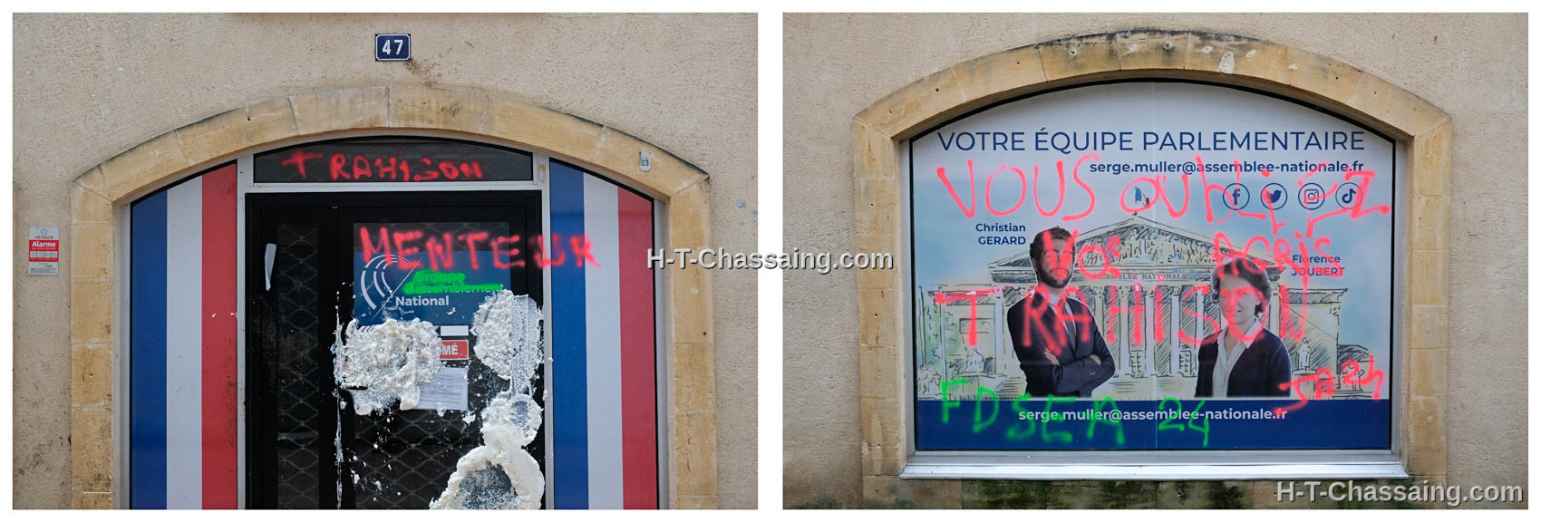 « Trahison – Menteur » « Vous oubliez vos agris – Trahison – FDSEA 24 – JA 24 » sur la devanture saccagée de la permanence du Rassemblement national. « Votre équipe parlementaire – Florence Joubert – serge.muller@assemblee-nationale.fr ». Bergerac. Dordogne, Nouvelle Aquitaine. France – 9 Décembre 2024.