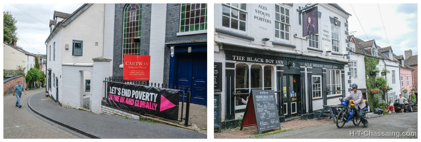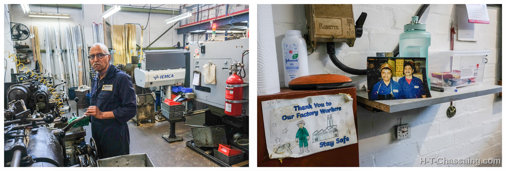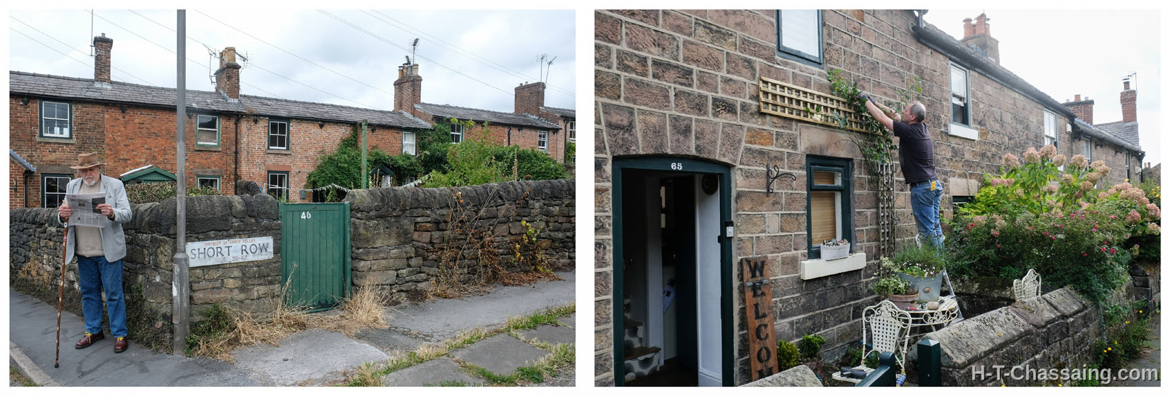 – À l’entrée de la rue « Short Row, district of Amber Valley », dans le prolongement de la William Street (William, l’un des 3 frères Strutt). La canne de ce monsieur a été fabriquée ici et chaque sticker correspond à un lieu visité, nous explique-t-il.