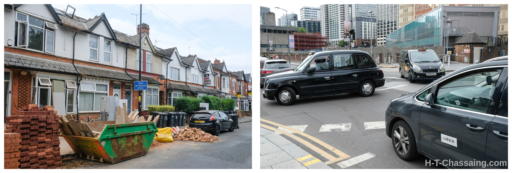 – Rond-point dans l’hypercentre de Birmingham qui comporte beaucoup d’immeubles modernes. Avec un véhicule Uber et les célèbres taxis noirs britanniques.