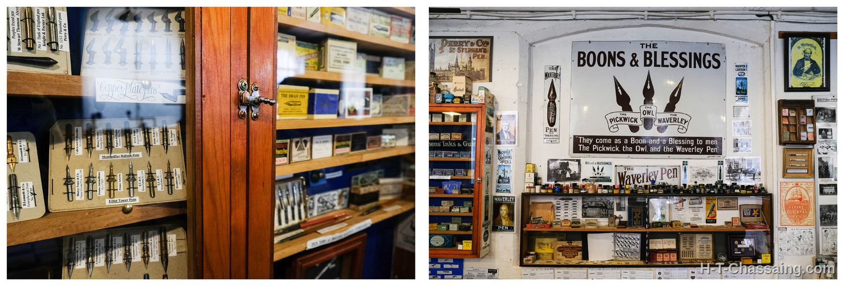 – Exposition des différents modèles de plumes dont celles-ci en forme de tour Eiffel : « Eiffel Tower Pens », sur l’étagère à gauche.