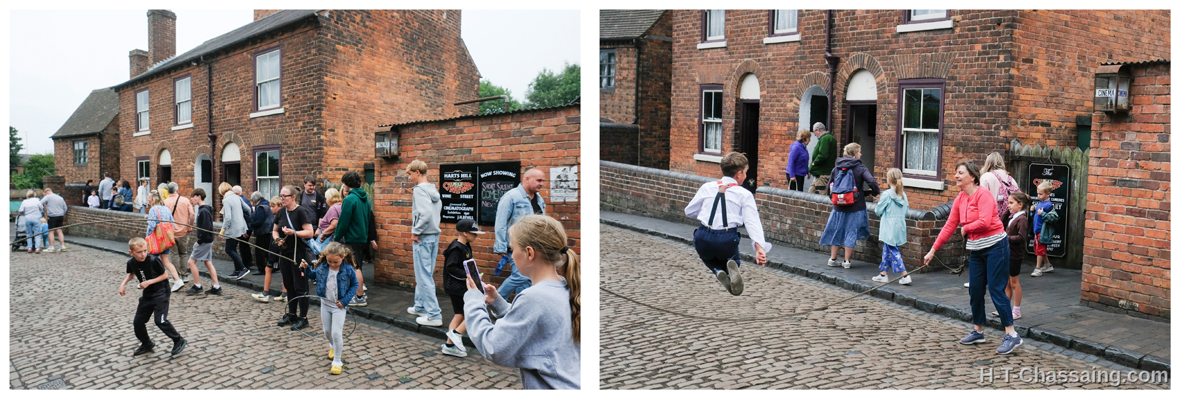 Jeu à la corde par les visiteurs dans cette rue d’époque reconstituée. Le garçon de droite est en habit d’époque. « Tous les bâtiments du musée en plein air sont originaux et ont été déplacés ici pour les sauver du développement », nous dit ERIH. Black Country Living Museum. Birmingham, Midlands de l’Ouest, Angleterre. Royaume-Uni – 19 Août 2024.