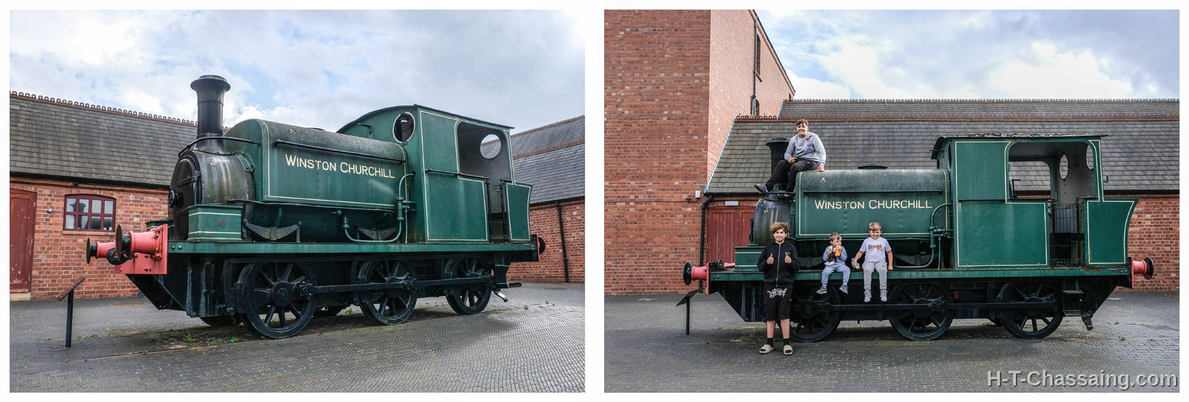 Locomotive à vapeur et donc fonctionnant au charbon devant le musée. Nommée Winston Churchill, le panneau dit : « « Locomotive Manning Wardle construite à la Boyne Engine Works à Leeds en 1923. Elle avait été commandée par les Frères Cadbury de Bournville et envoyée à l’usine de Blackpole dans le Worcestershire ». Black Country Living Museum. Birmingham, Midlands de l’Ouest, Angleterre. Royaume-Uni – 19 Août 2024.